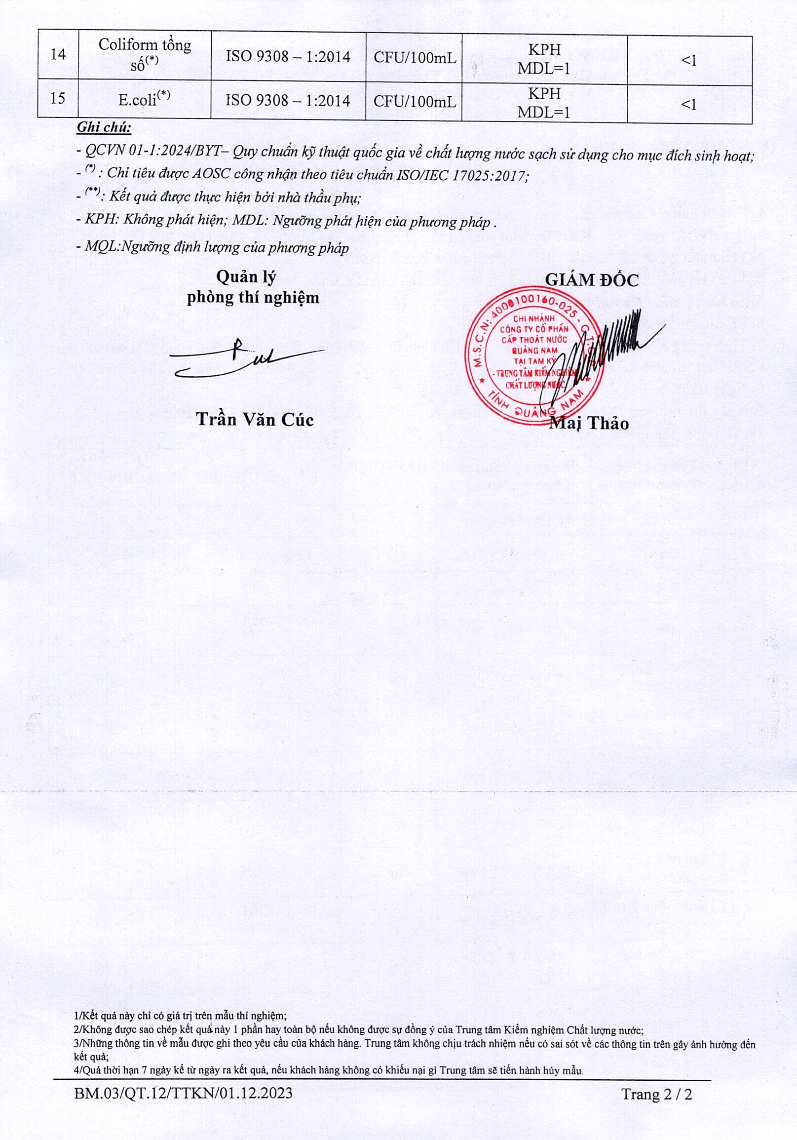 KẾT QUẢ CHẤT LƯỢNG NƯỚC XÍ NGHIỆP CẤP THOÁT NƯỚC TAM KỲ ĐỢT 2 THÁNG 12 NĂM 2022