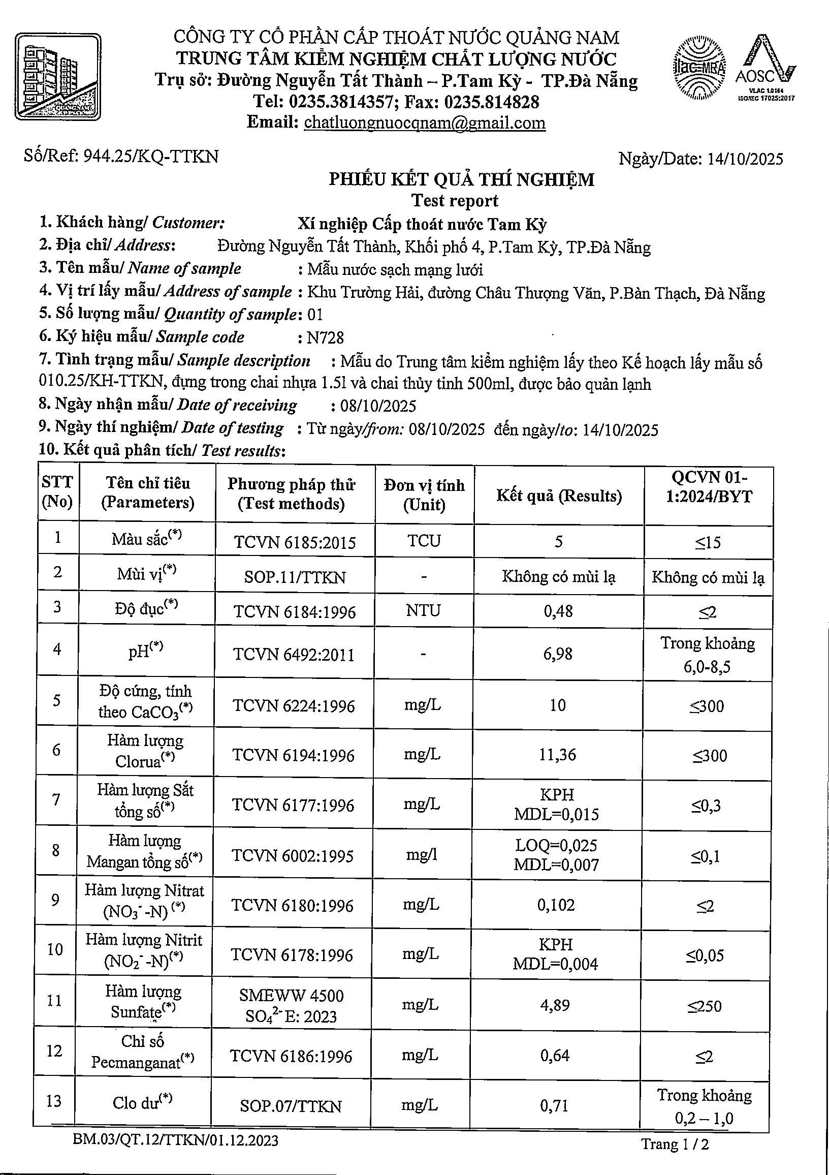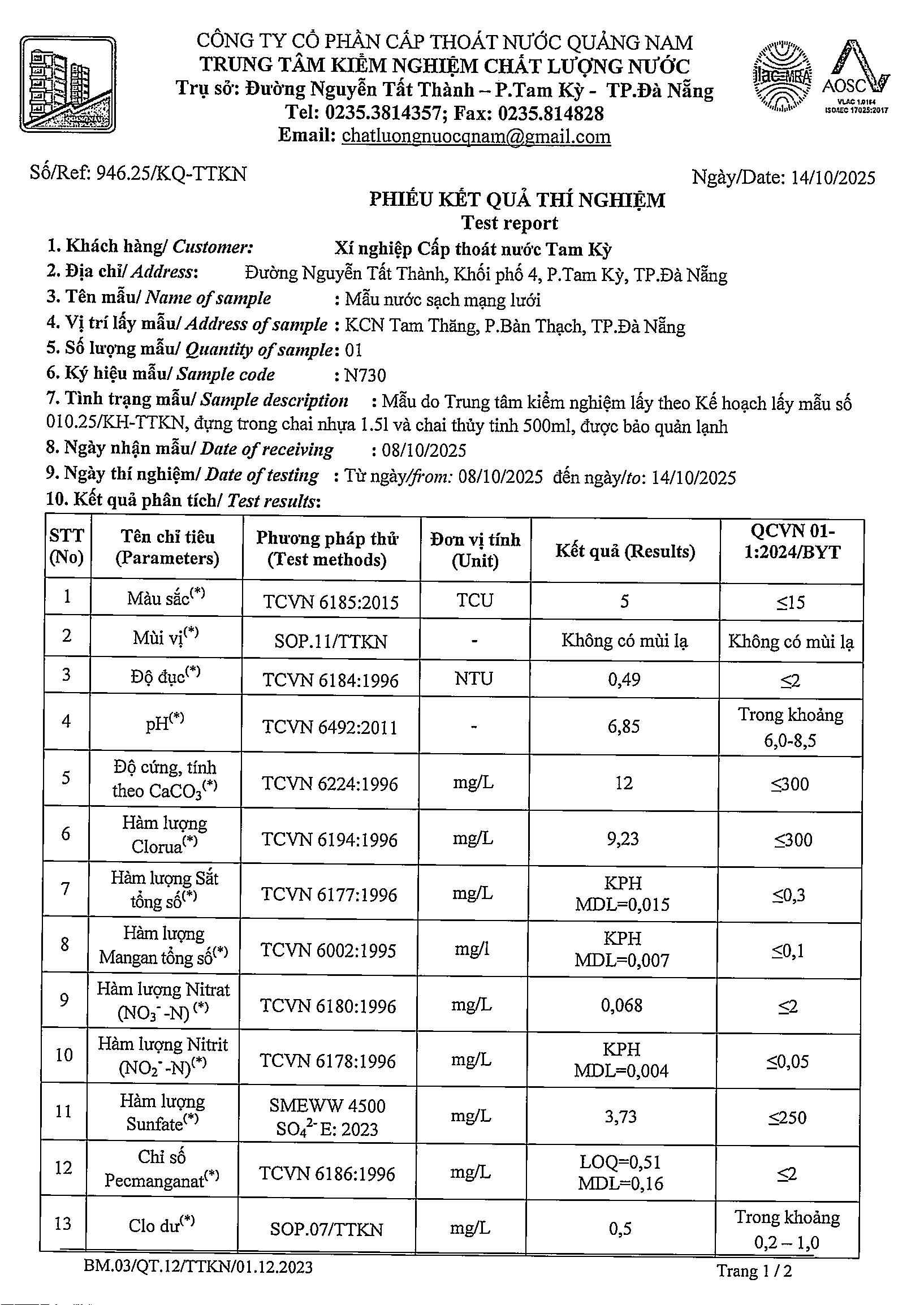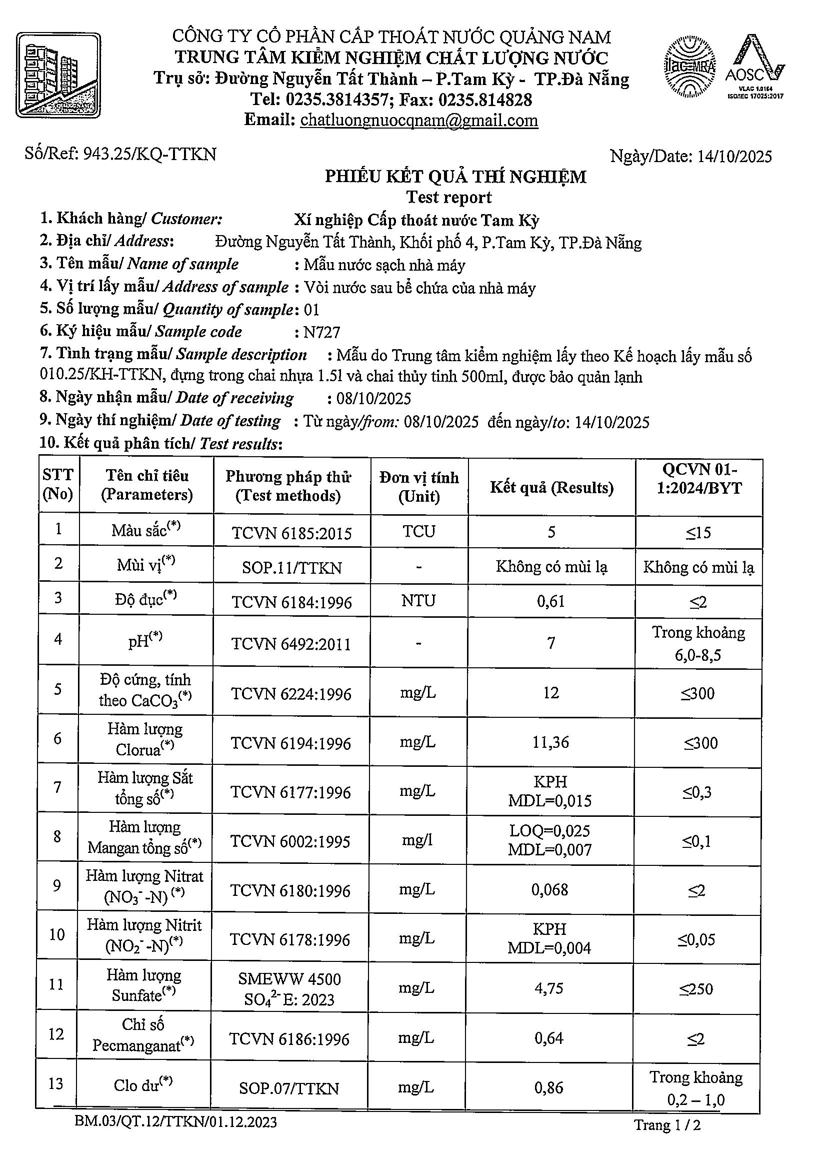 KẾT QUẢ CHẤT LƯỢNG NƯỚC XÍ NGHIỆP CẤP THOÁT NƯỚC TAM KỲ ĐỢT 1 THÁNG 10 NĂM 2025