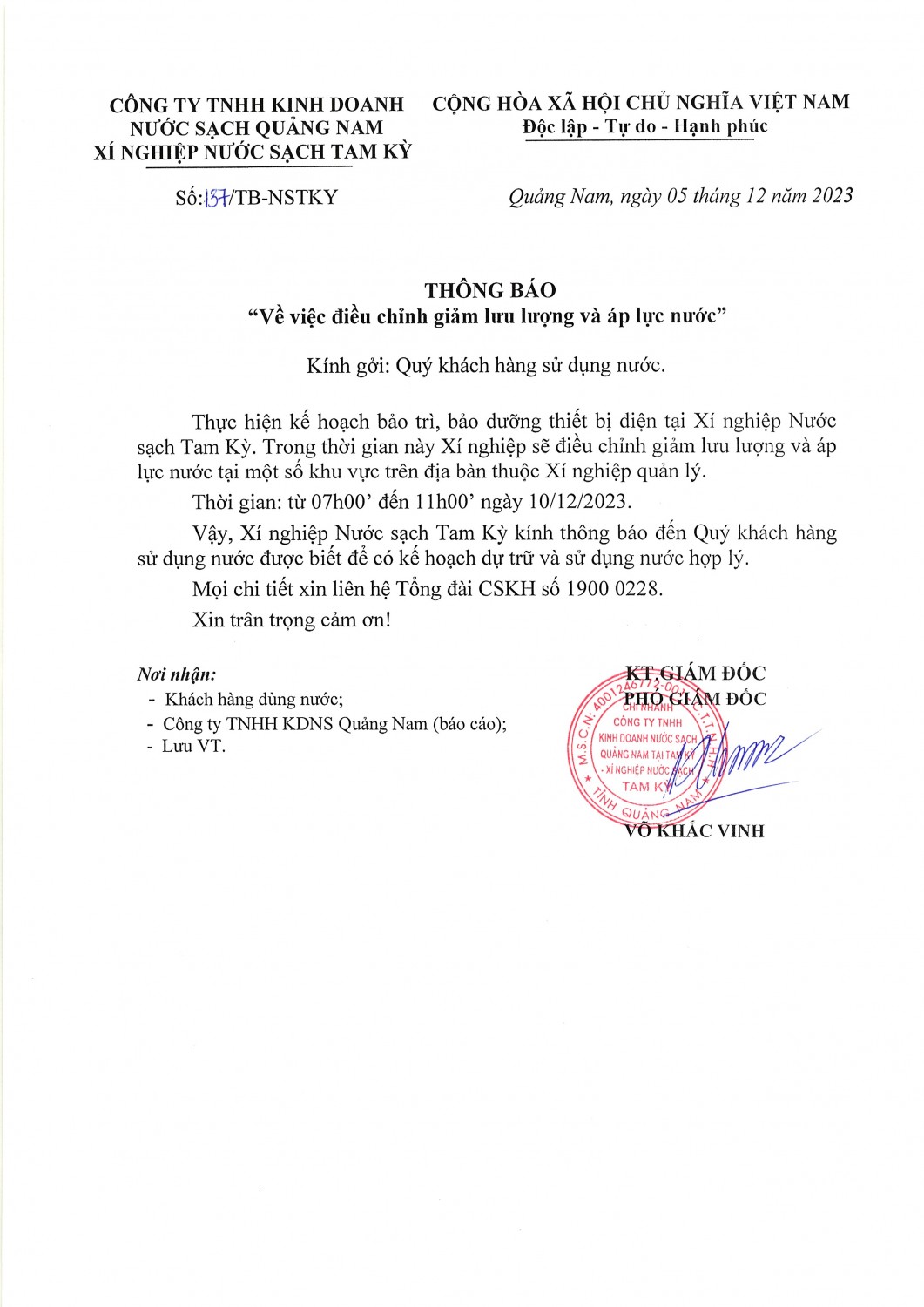 Thông báo về việc điều chỉnh lưu lượng và áp lực nước sạch trên địa bàn thành phố Tam Kỳ ngày 10/12/2023