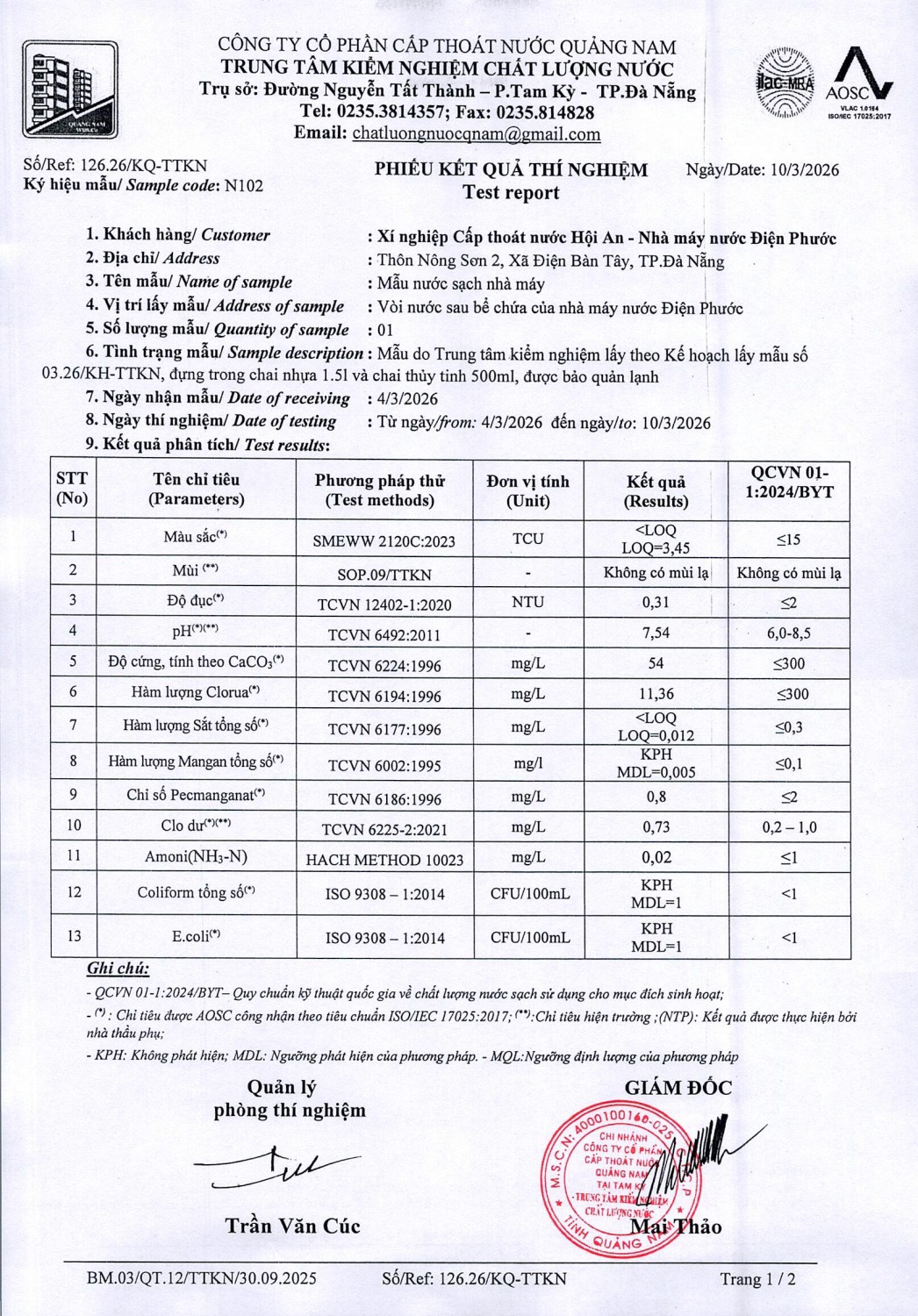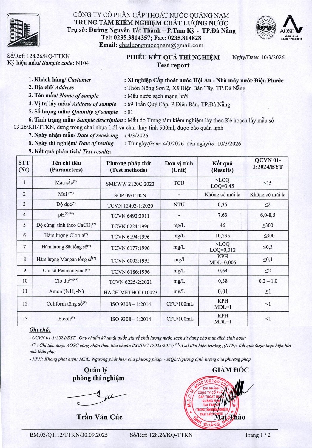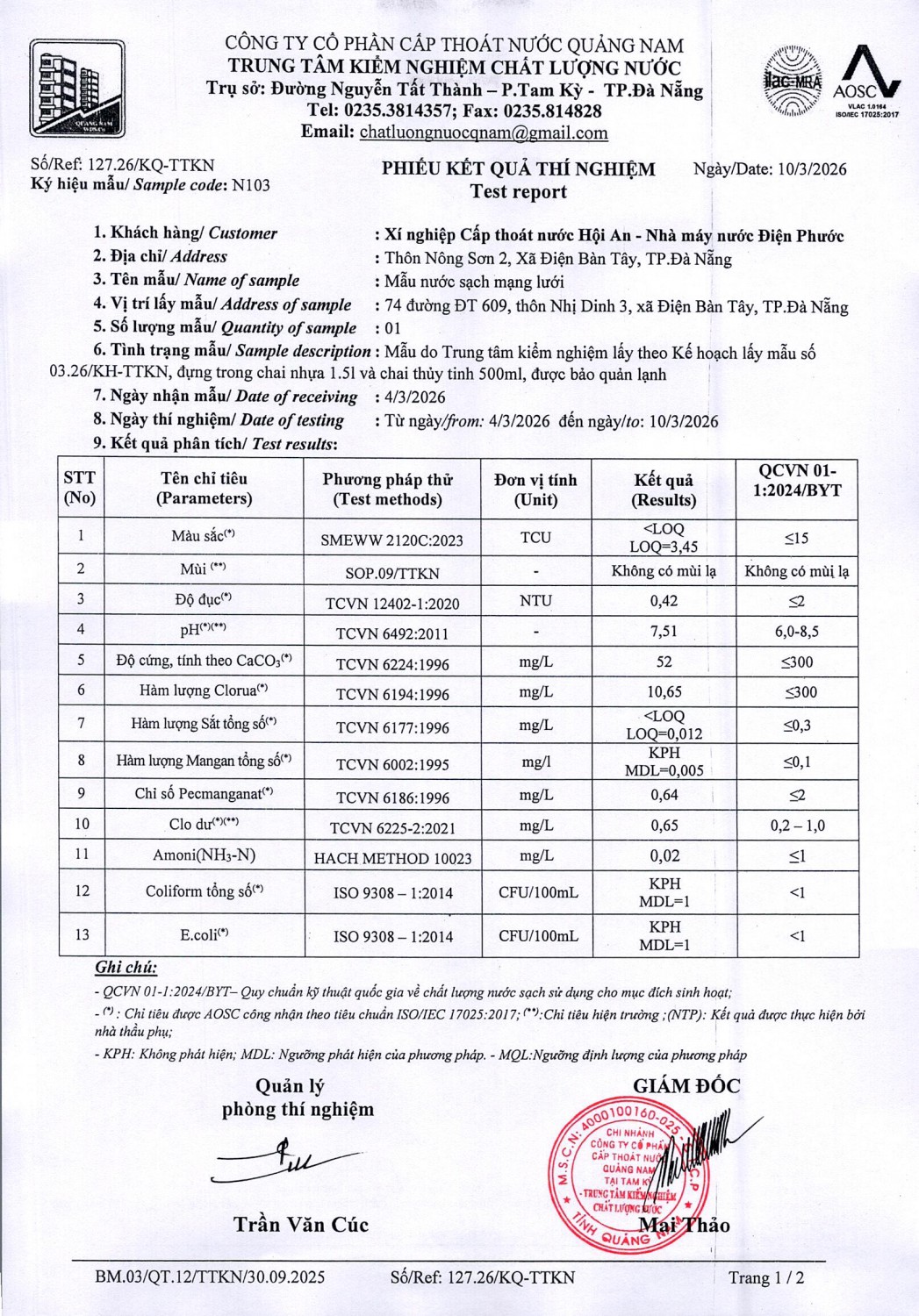 KẾT QUẢ CHẤT LƯỢNG NƯỚC XÍ NGHIỆP CTN HỘI AN - NMN ĐIỆN PHƯỚC ĐỢT 1 THÁNG 3 NĂM 2026