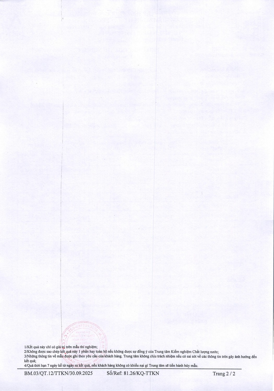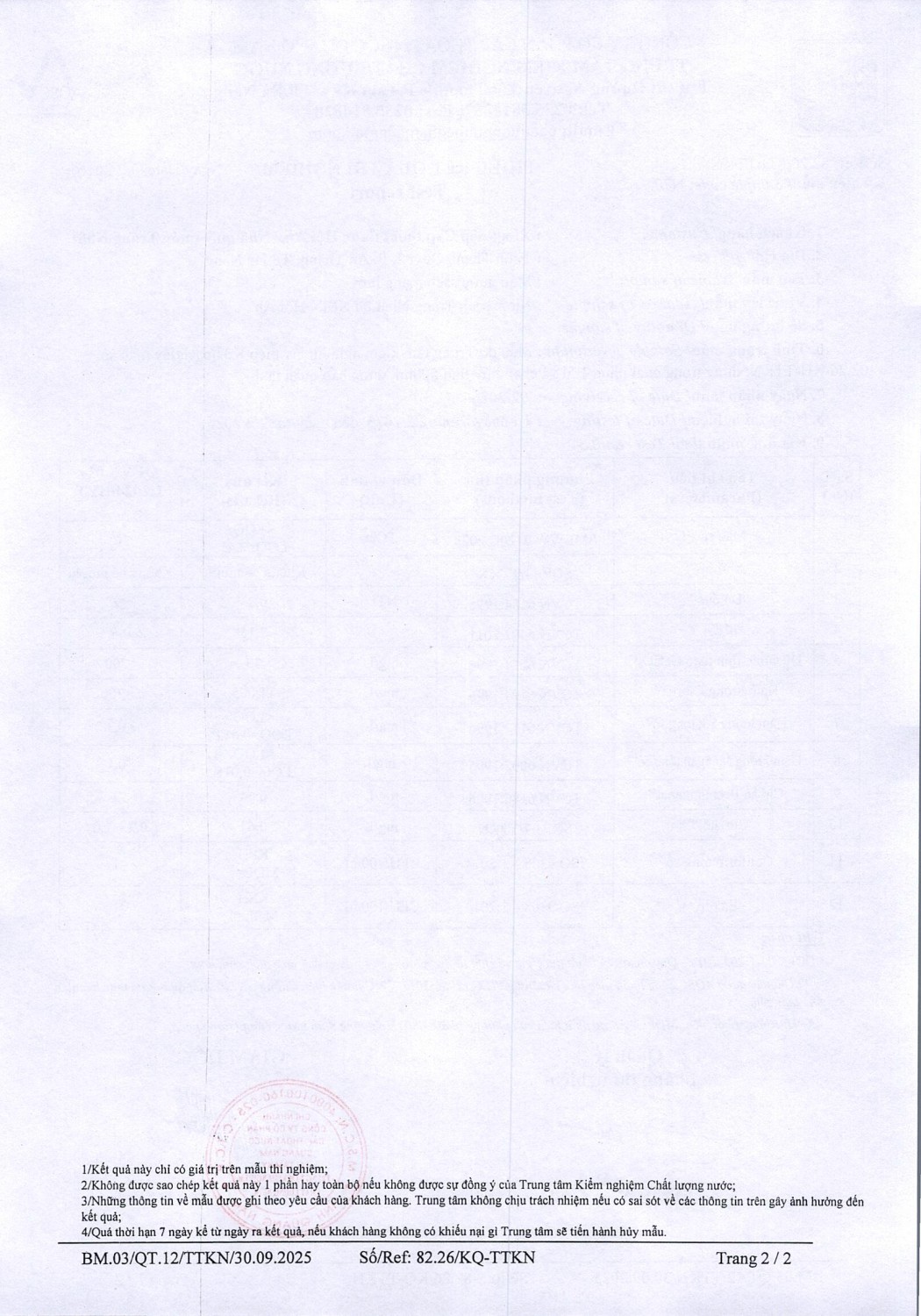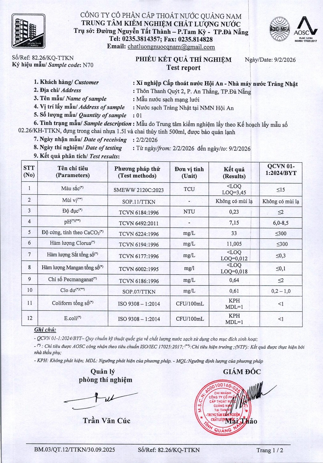 KẾT QUẢ CHẤT LƯỢNG NƯỚC XÍ NGHIỆP CTN HỘI AN - NMN TRẢNG NHẬT THÁNG 2 NĂM 2026