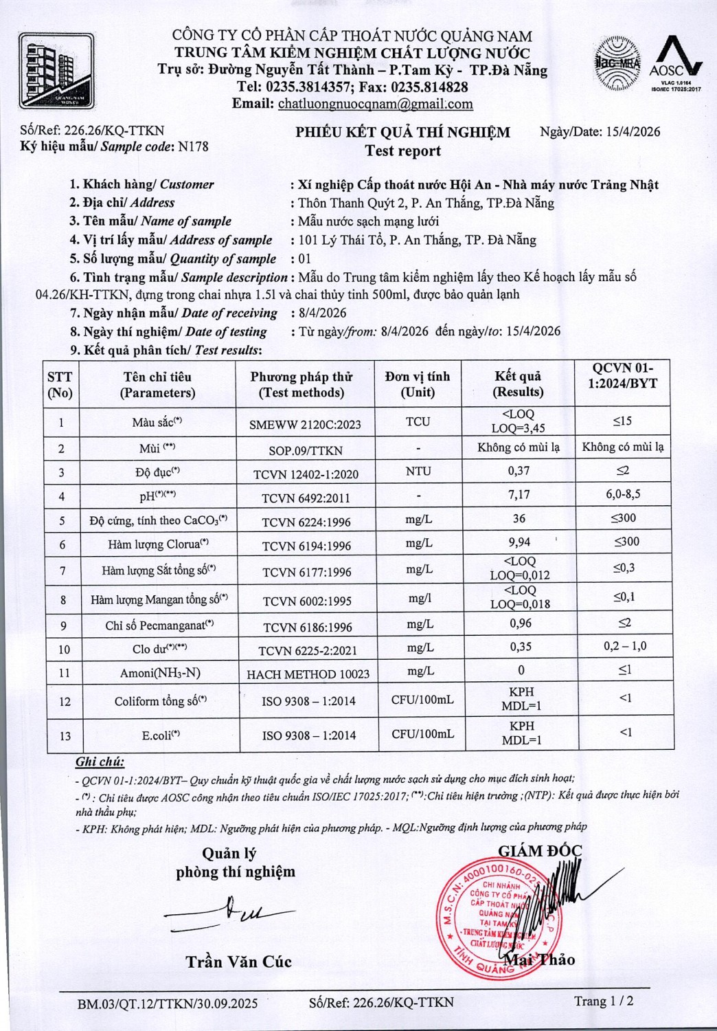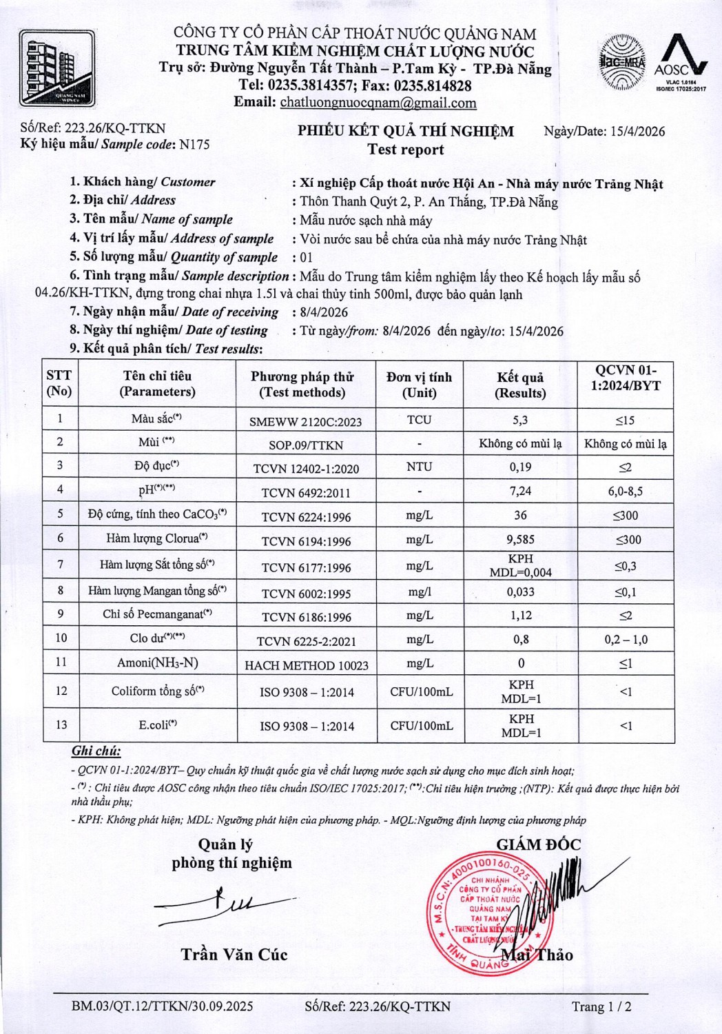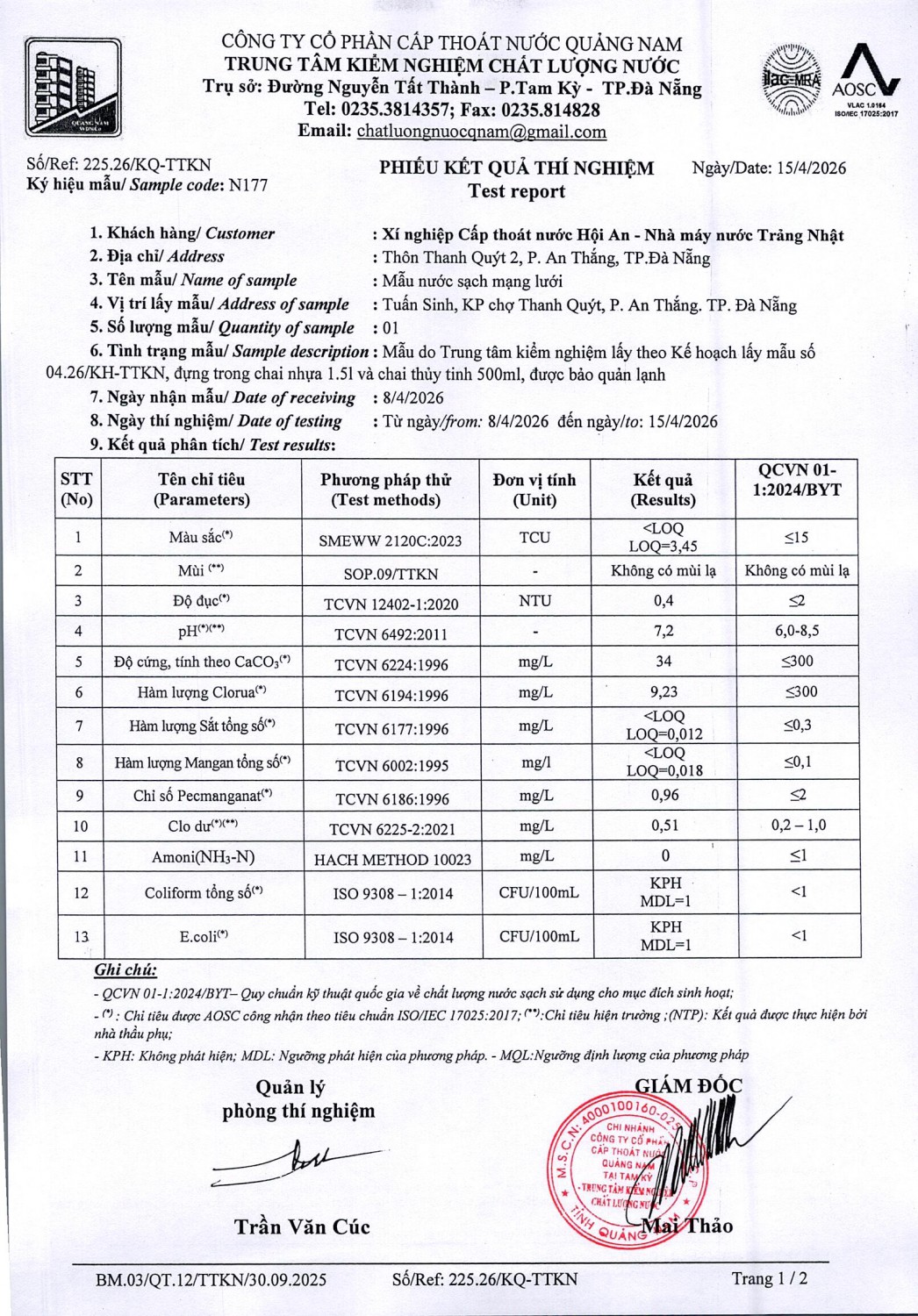 KẾT QUẢ CHẤT LƯỢNG NƯỚC XÍ NGHIỆP CTN HỘI AN - NMN TRẢNG NHẬT THÁNG 4 NĂM 2026