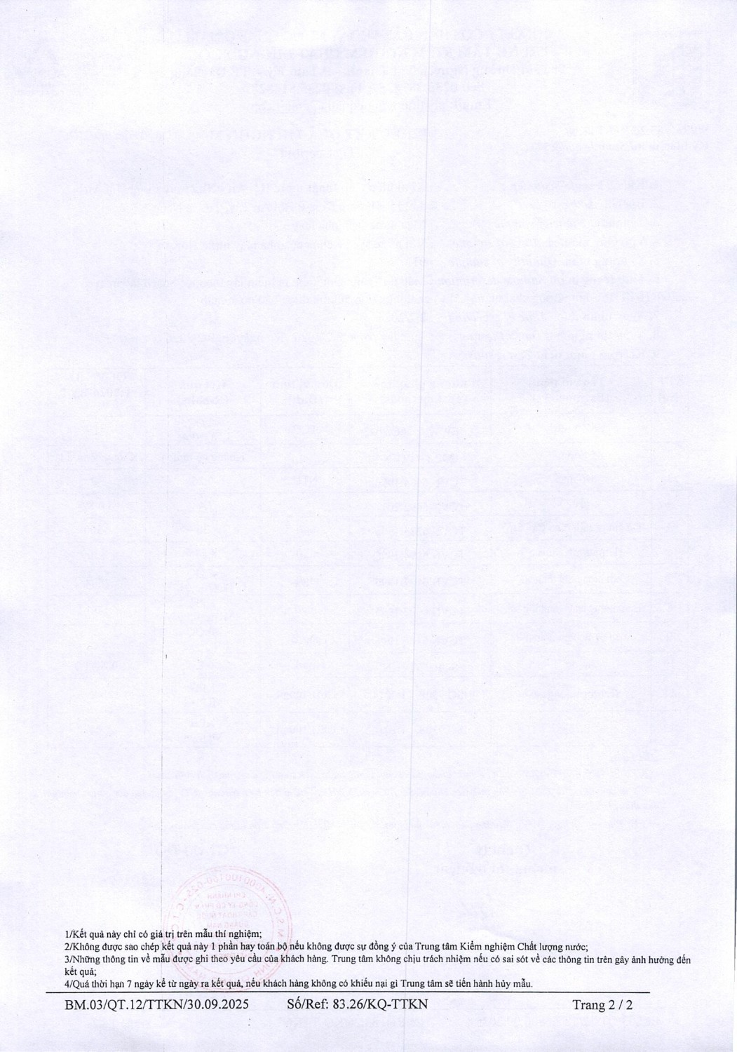 KẾT QUẢ CHẤT LƯỢNG NƯỚC XÍ NGHIỆP CTN HỘI AN - NMN HỘI AN THÁNG 2 NĂM 2026
