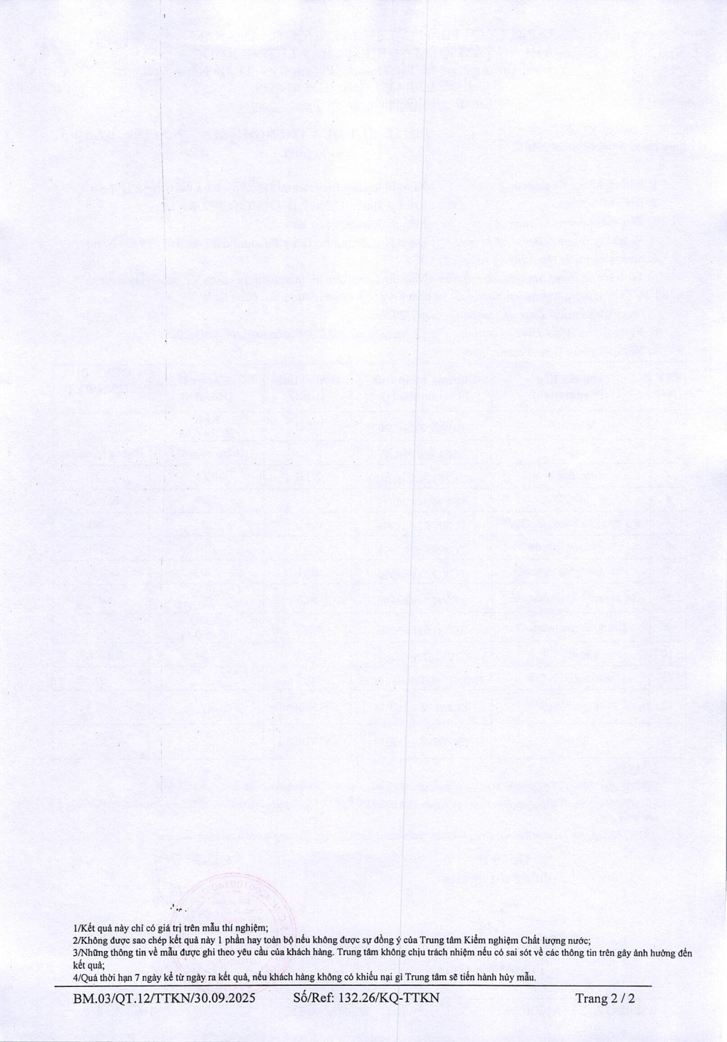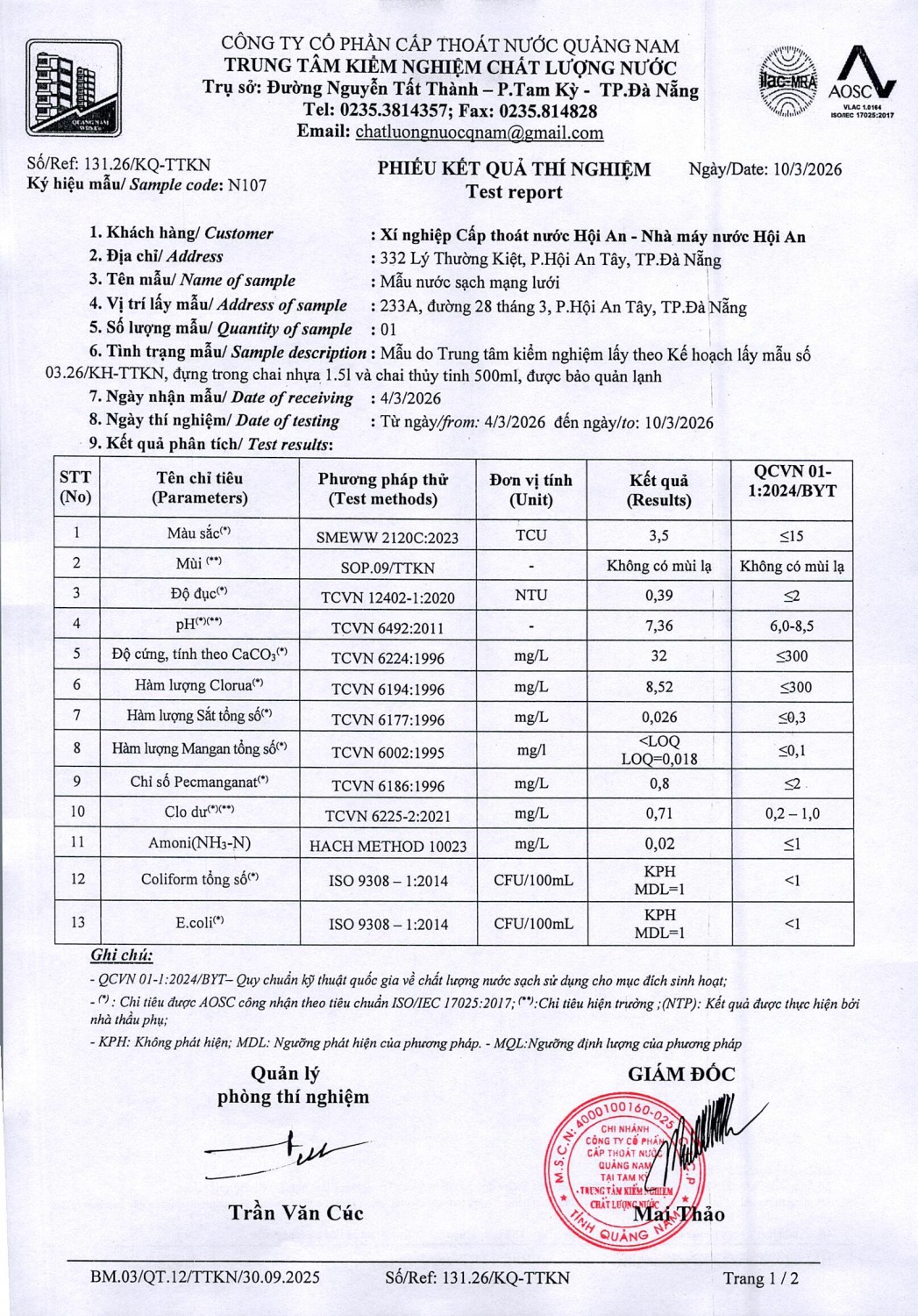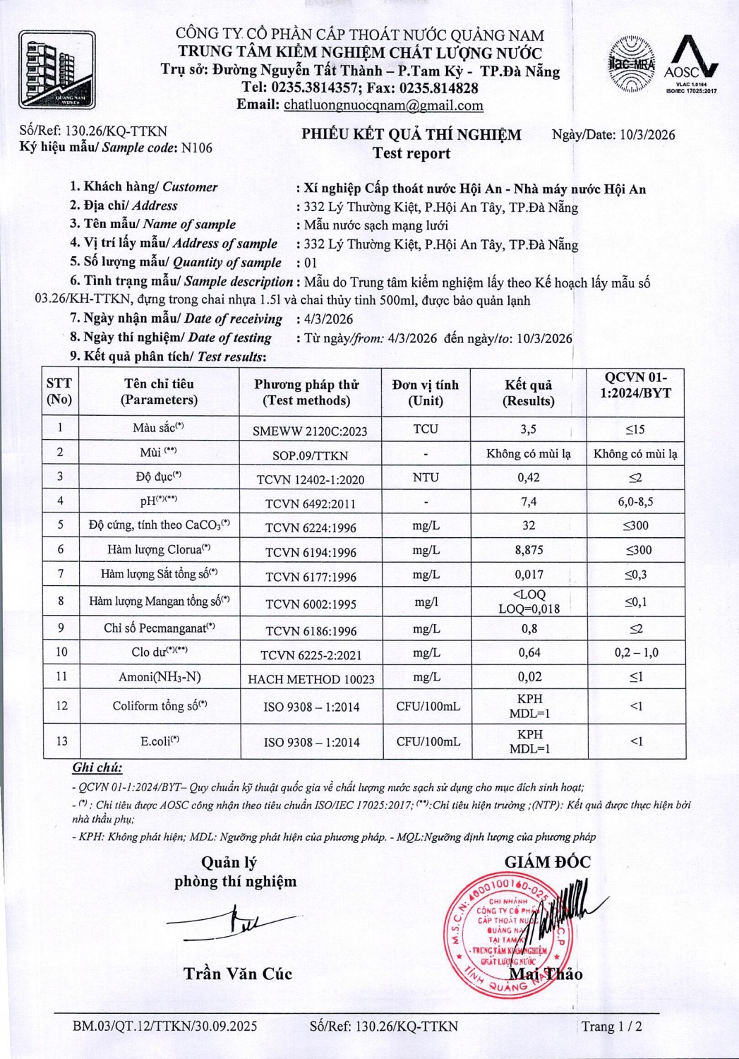 KẾT QUẢ CHẤT LƯỢNG NƯỚC XÍ NGHIỆP CTN HỘI AN - NMN HỘI AN ĐỢT 1 THÁNG 3 NĂM 2026