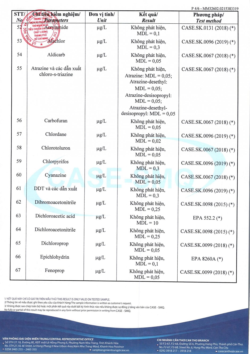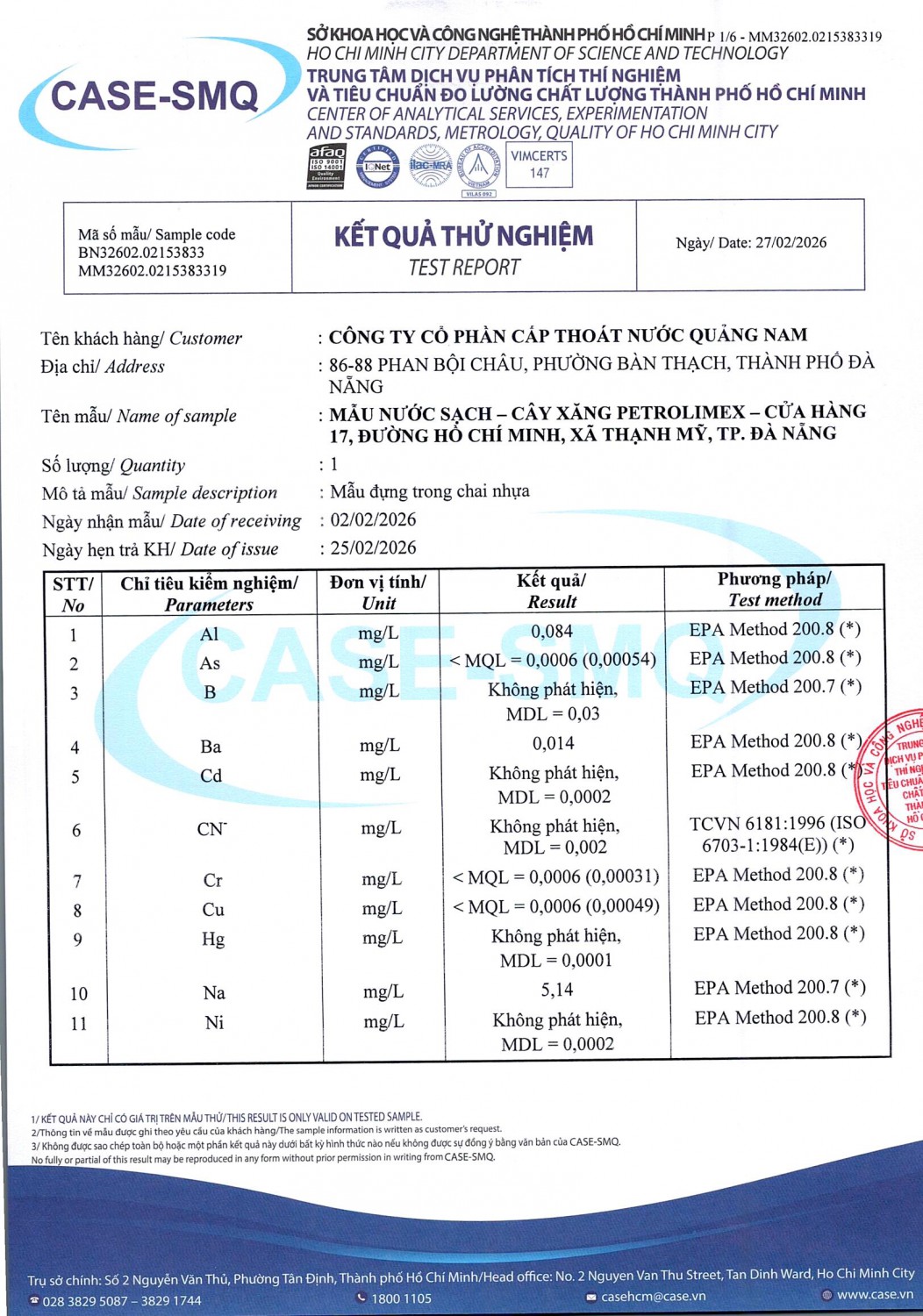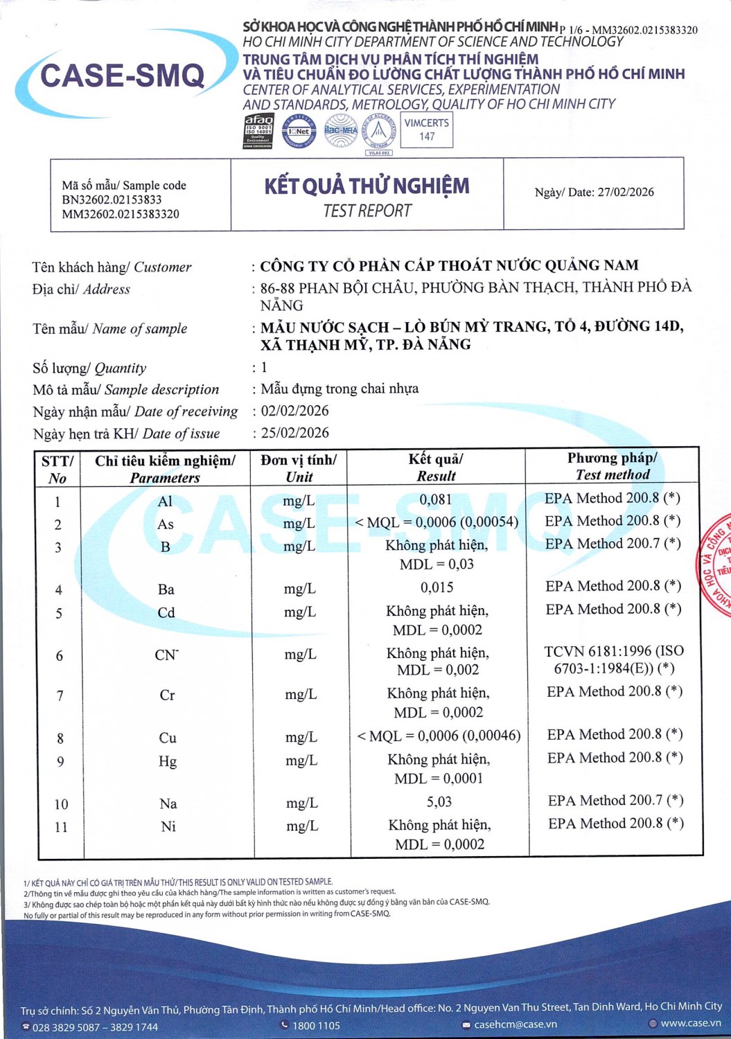 KẾT QUẢ CHẤT LƯỢNG NƯỚC CHỈ TIÊU B XÍ NGHIỆP CẤP THOÁT NƯỚC KHÂM ĐỨC - NHÀ MÁY NƯỚC NAM GIANG ĐỢT 1 NĂM 2026