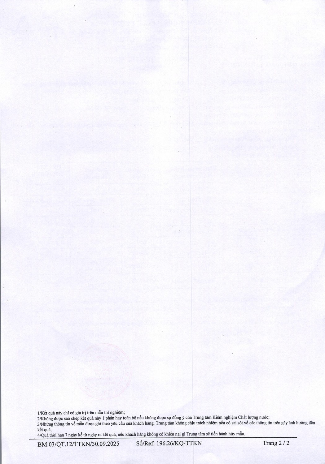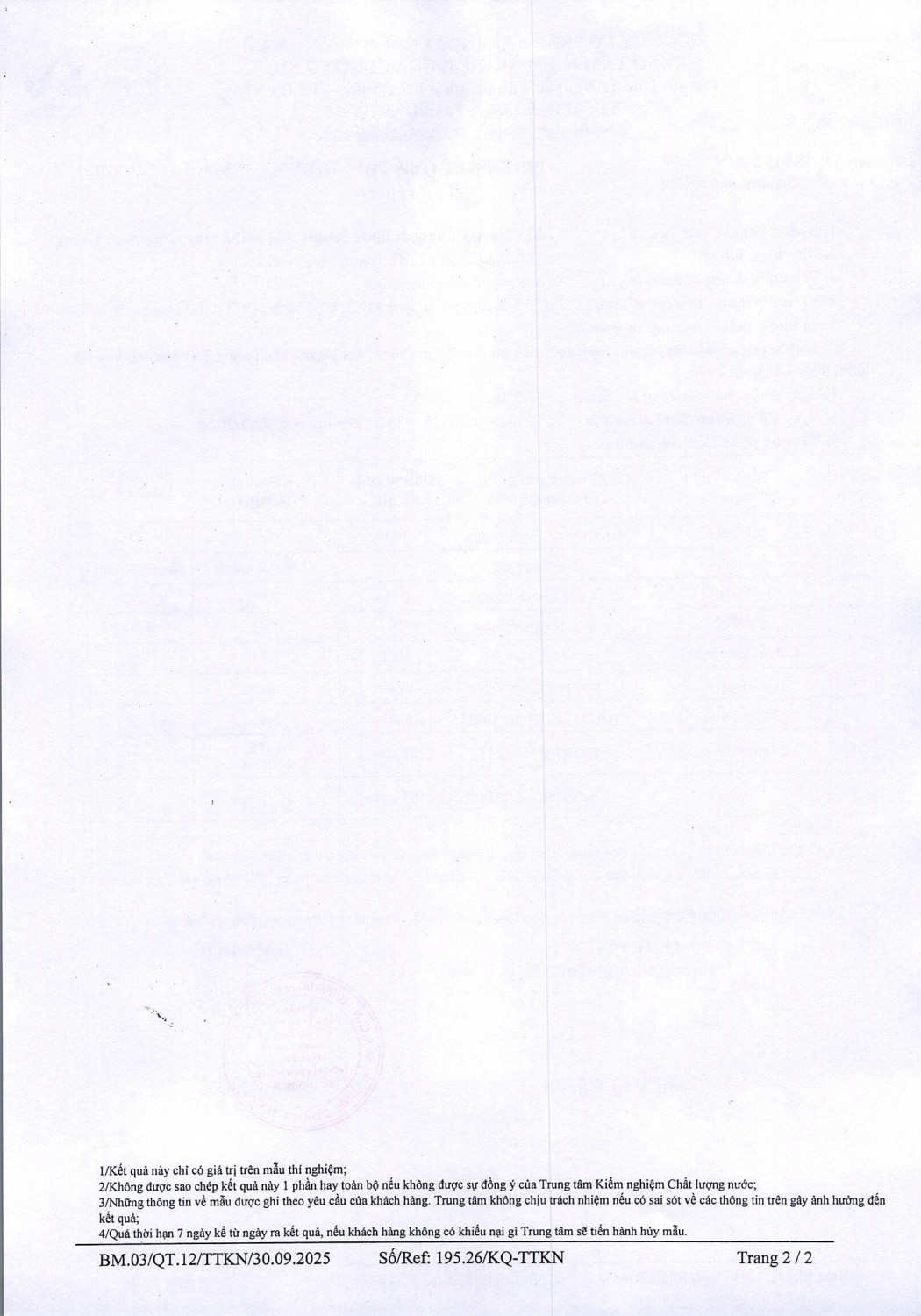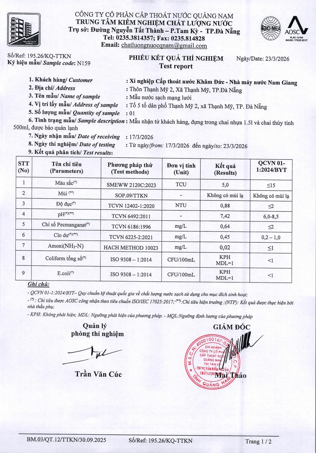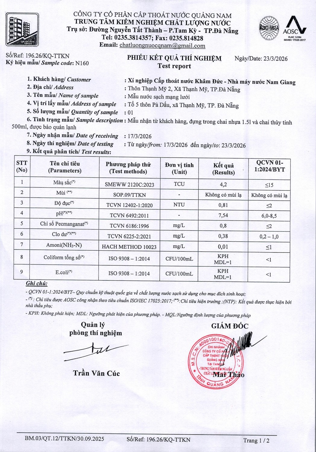 KẾT QUẢ CHẤT LƯỢNG NƯỚC XÍ NGHIỆP CTN KHÂM ĐỨC - NMN NAM GIANG ĐỢT 2 THÁNG 3 NĂM 2026