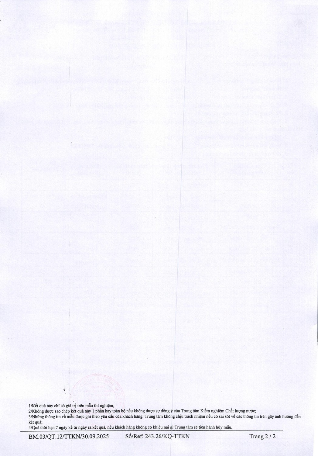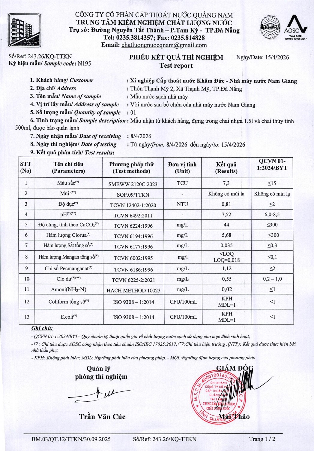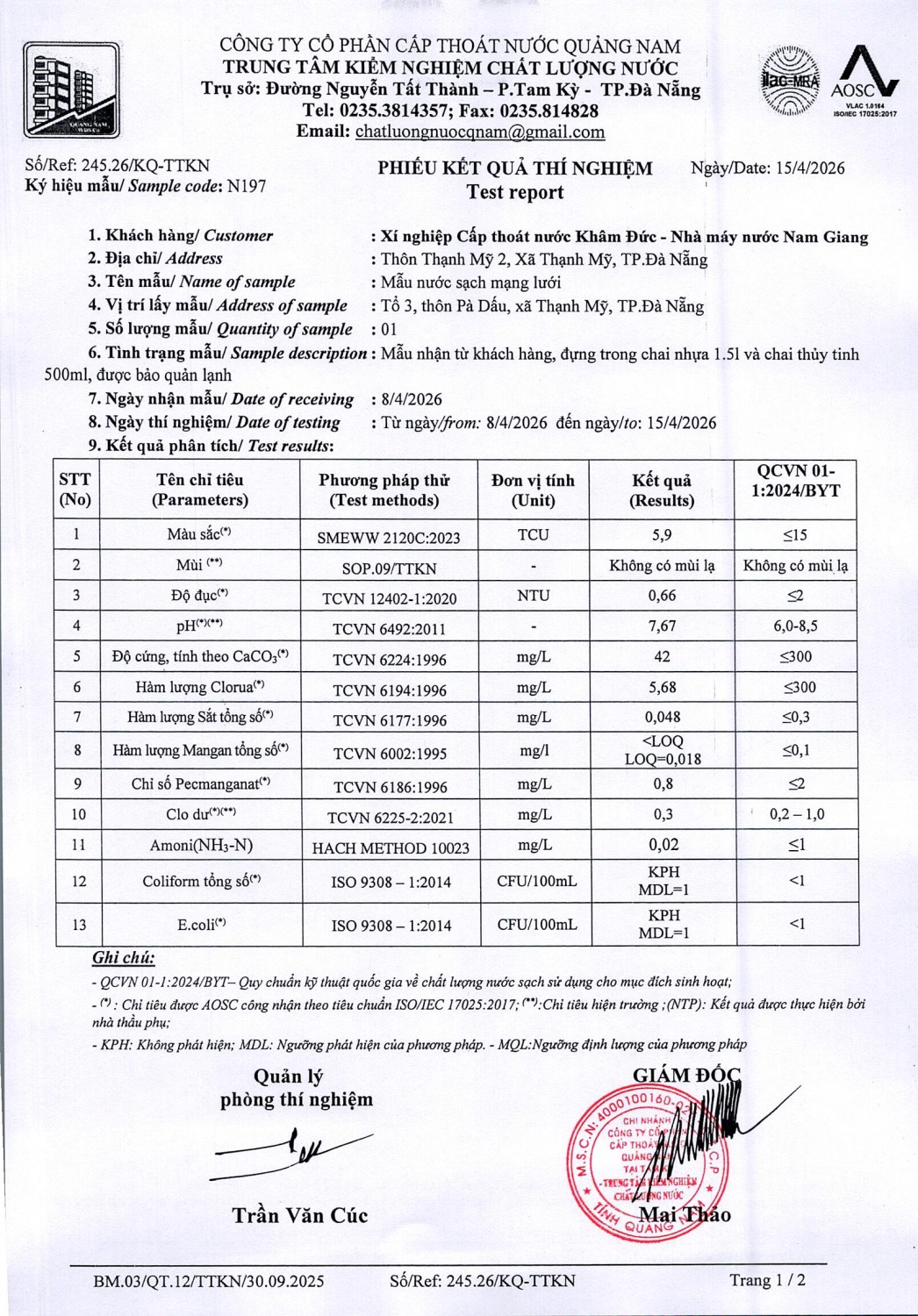 KẾT QUẢ CHẤT LƯỢNG NƯỚC XÍ NGHIỆP CTN KHÂM ĐỨC - NMN NAM GIANG THÁNG 4 NĂM 2026