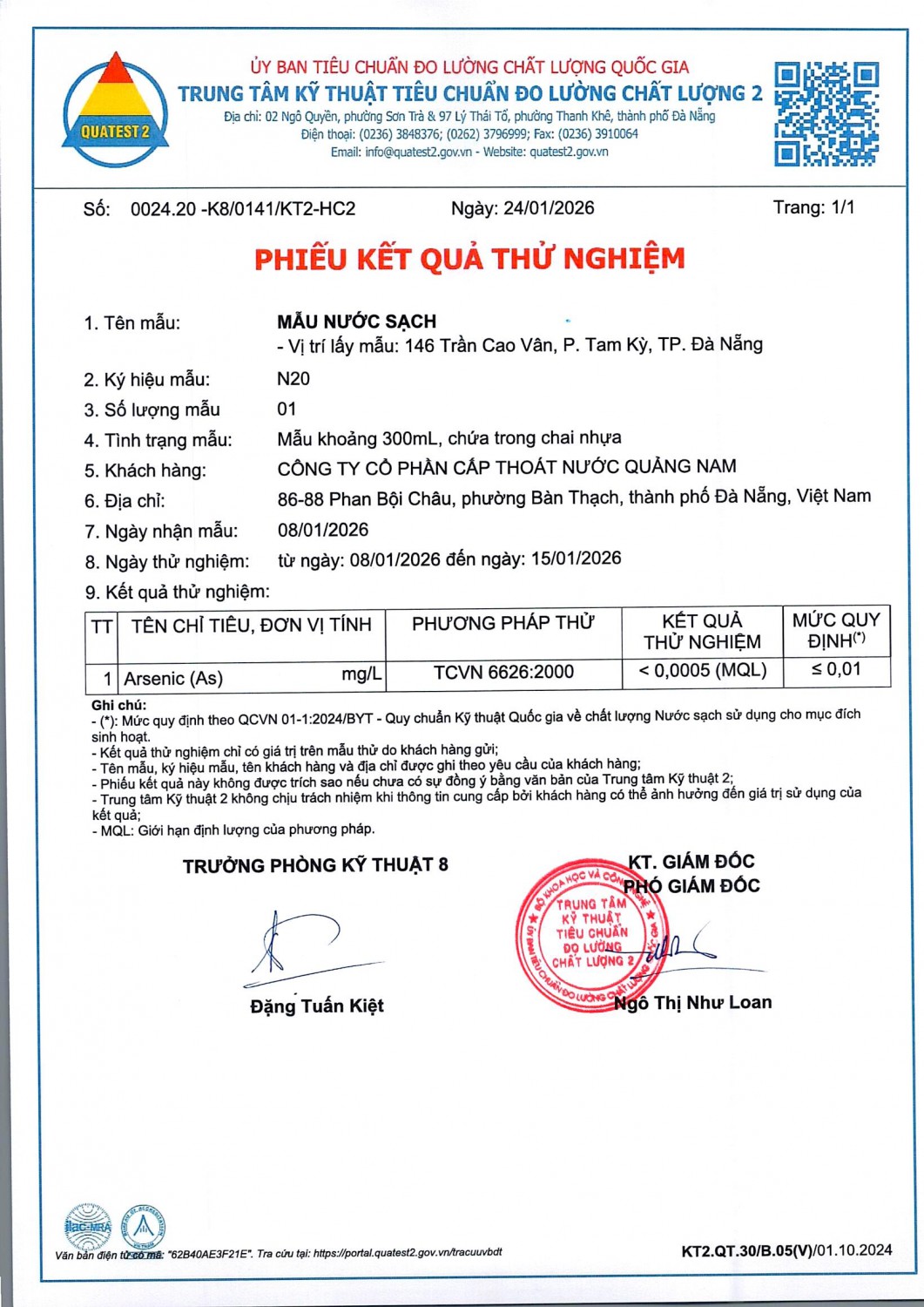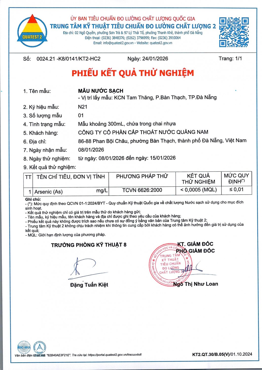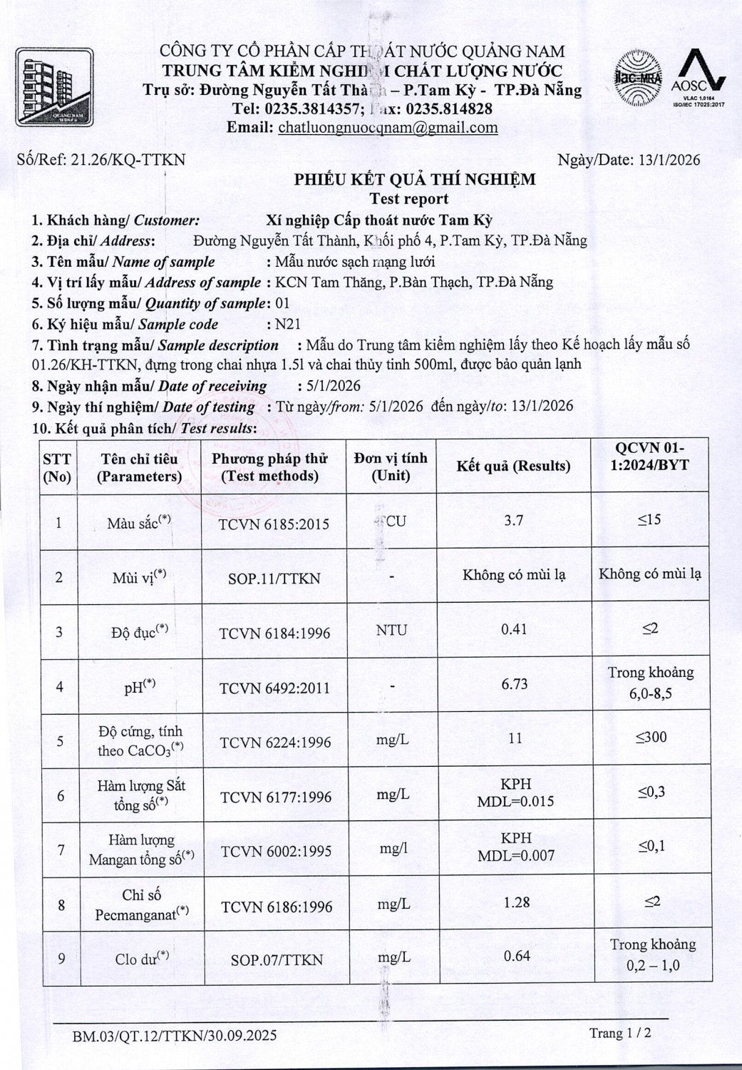 KẾT QUẢ CHẤT LƯỢNG NƯỚC XÍ NGHIỆP CTN TAM KỲ - NMN TAM KỲ THÁNG 1 NĂM 2026