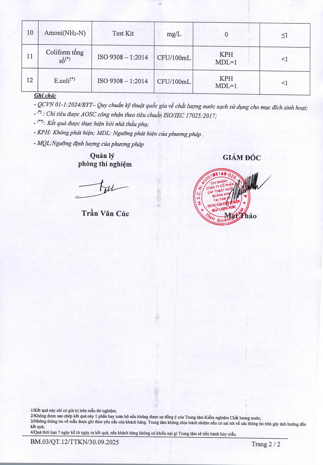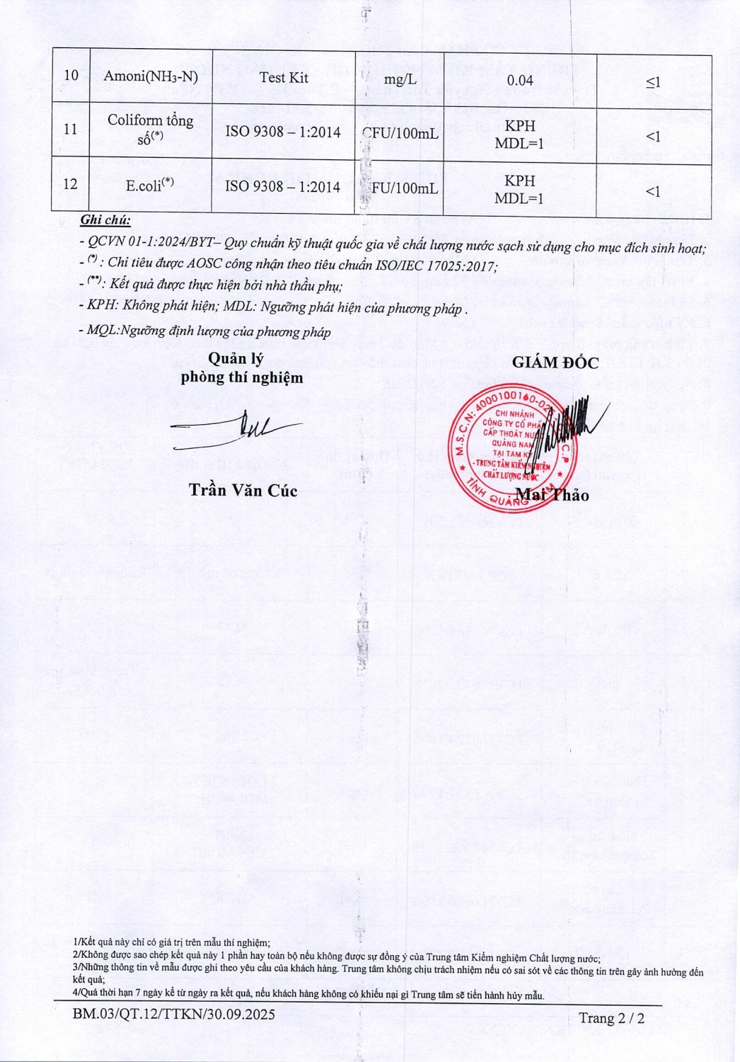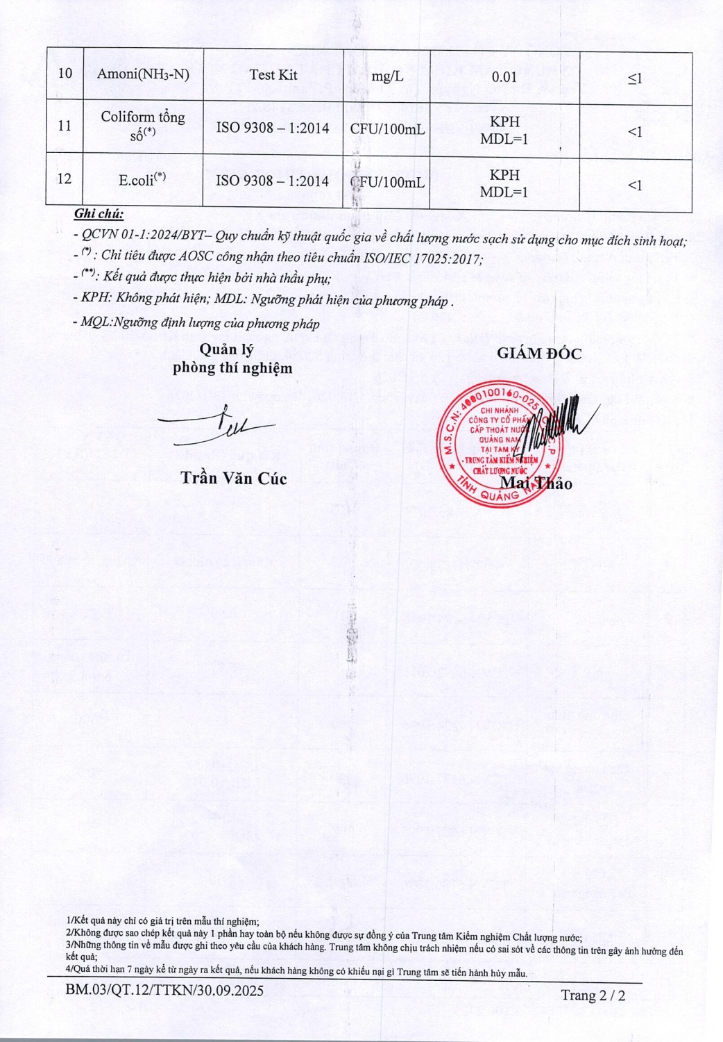 KẾT QUẢ CHẤT LƯỢNG NƯỚC XÍ NGHIỆP CTN TAM KỲ - NMN TAM KỲ THÁNG 1 NĂM 2026