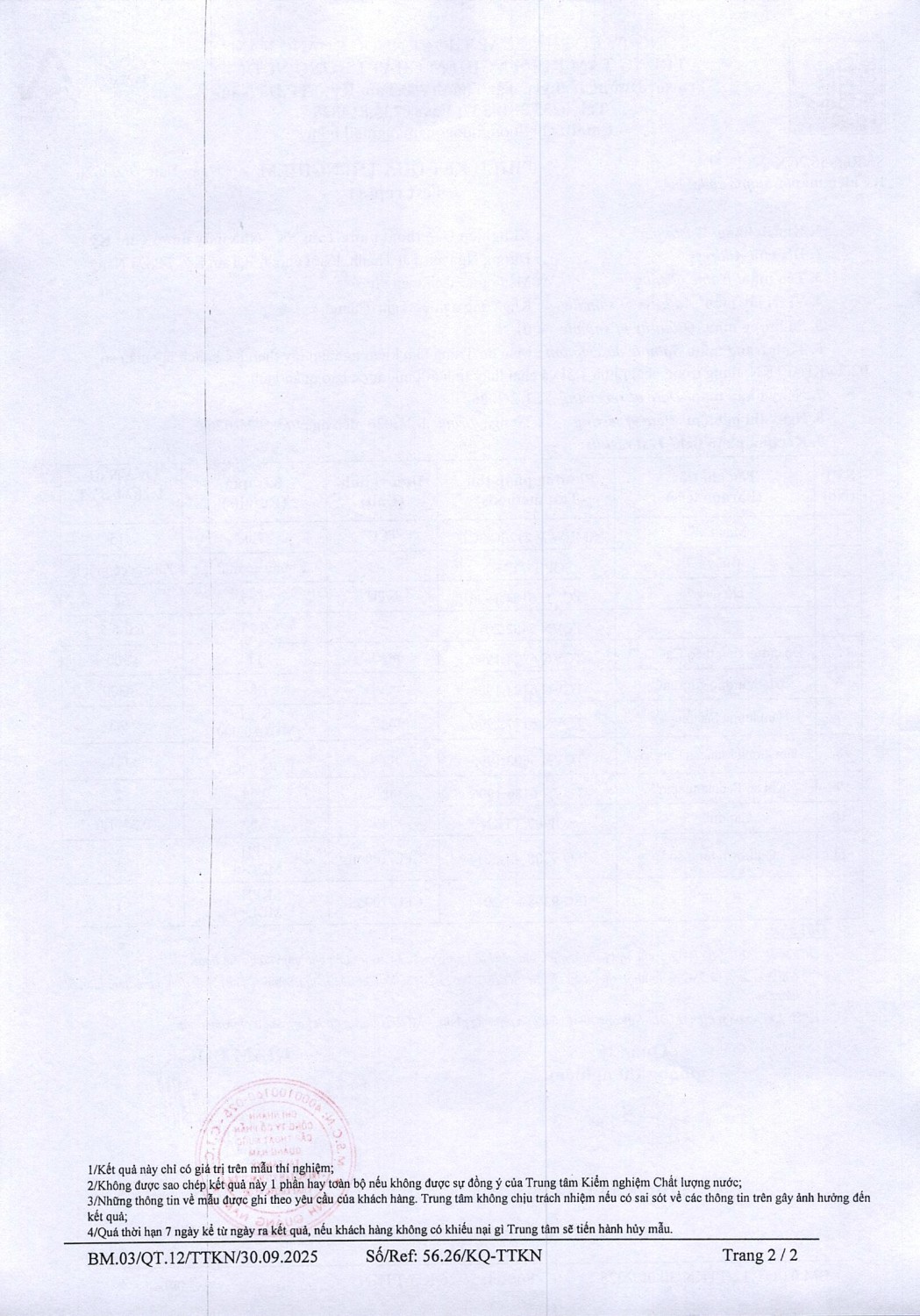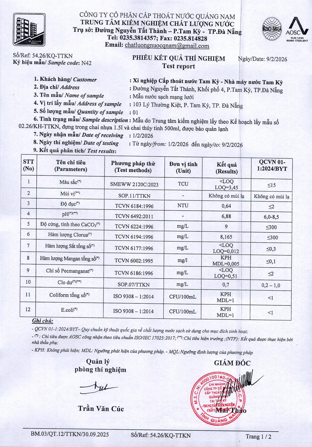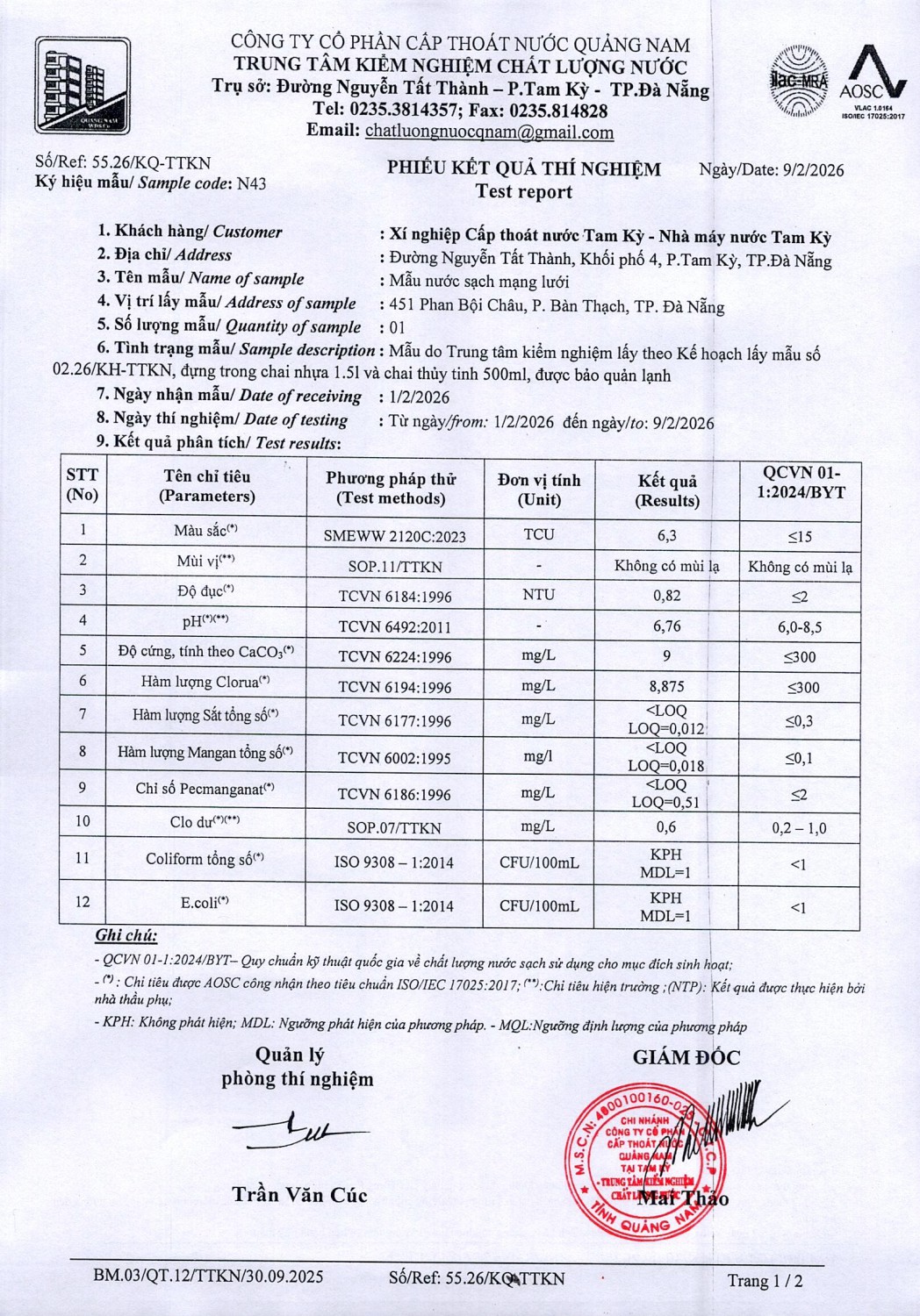 KẾT QUẢ CHẤT LƯỢNG NƯỚC XÍ NGHIỆP CTN TAM KỲ - NMN TAM KỲ THÁNG 2 NĂM 2026