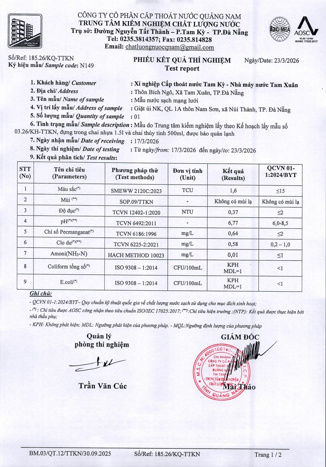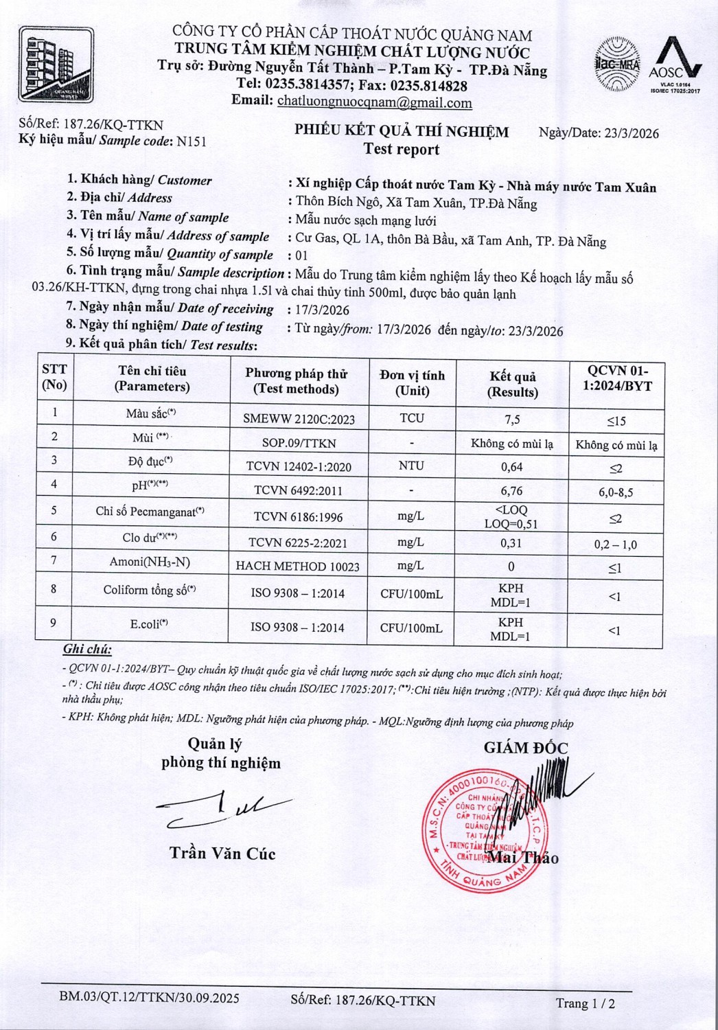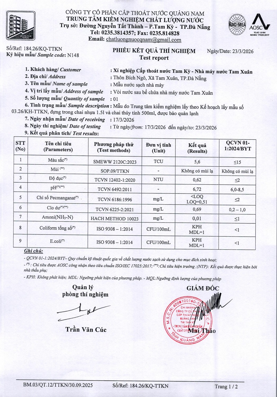 KẾT QUẢ CHẤT LƯỢNG NƯỚC XÍ NGHIỆP CTN TAM KỲ - NMN TAM XUÂN ĐỢT 2 THÁNG 3 NĂM 2026