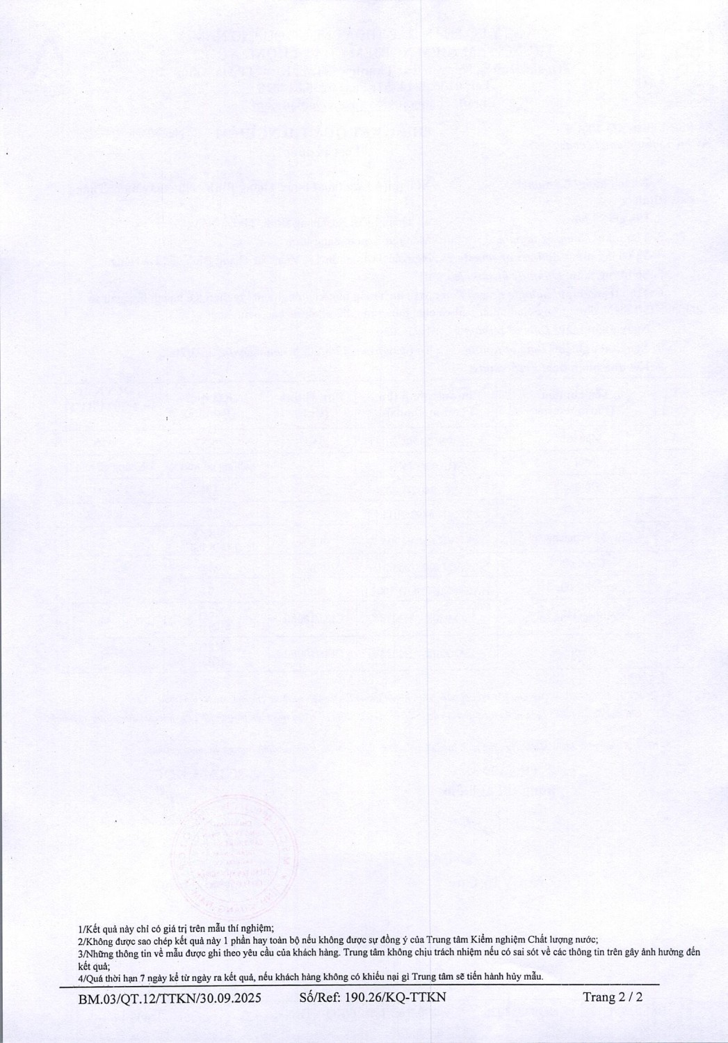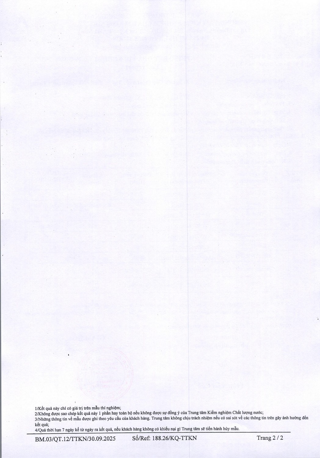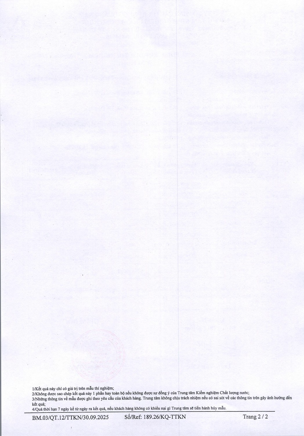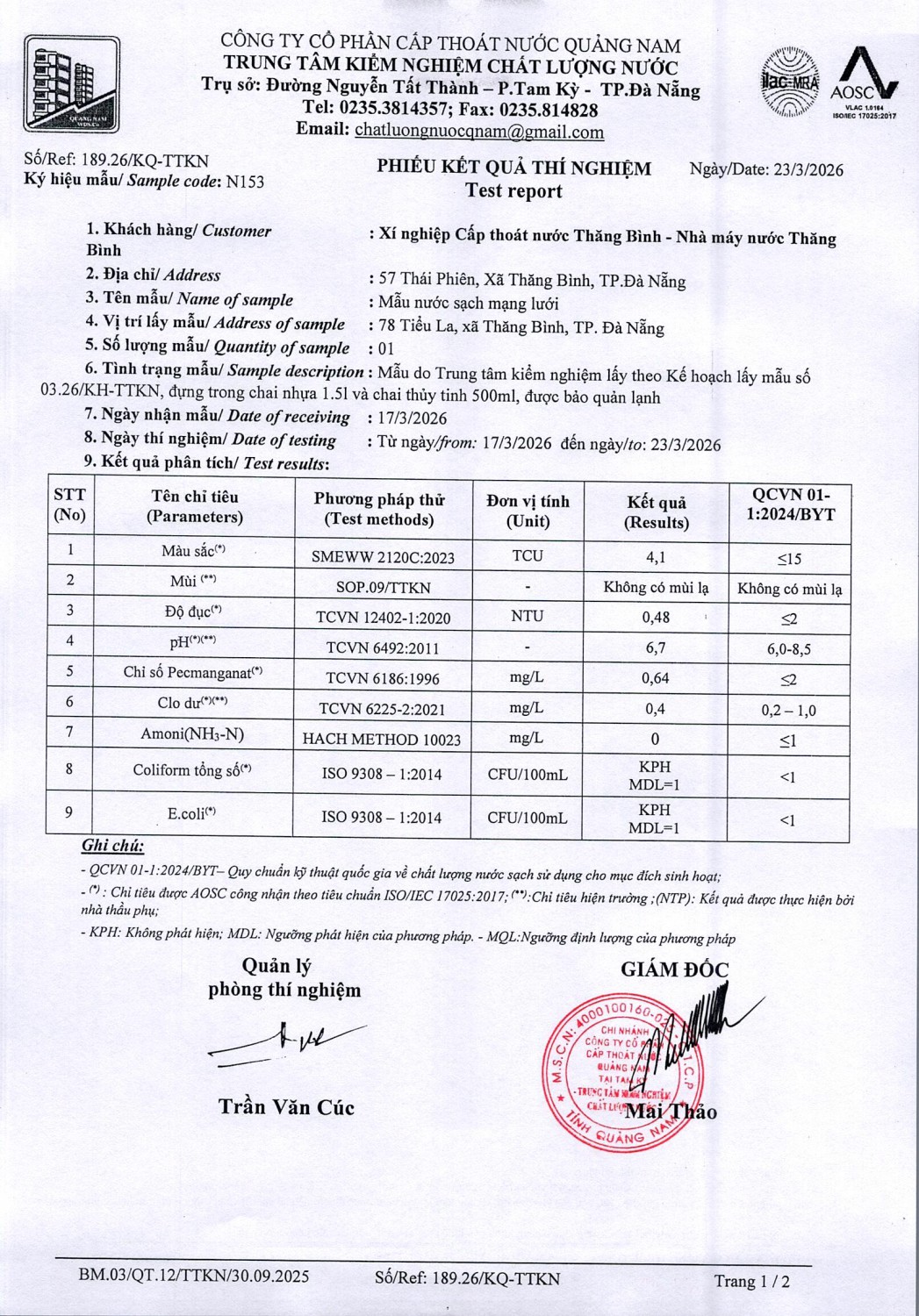 KẾT QUẢ CHẤT LƯỢNG NƯỚC XÍ NGHIỆP CTN THĂNG BÌNH - NMN THĂNG BÌNH ĐỢT 2 THÁNG 3 NĂM 2026