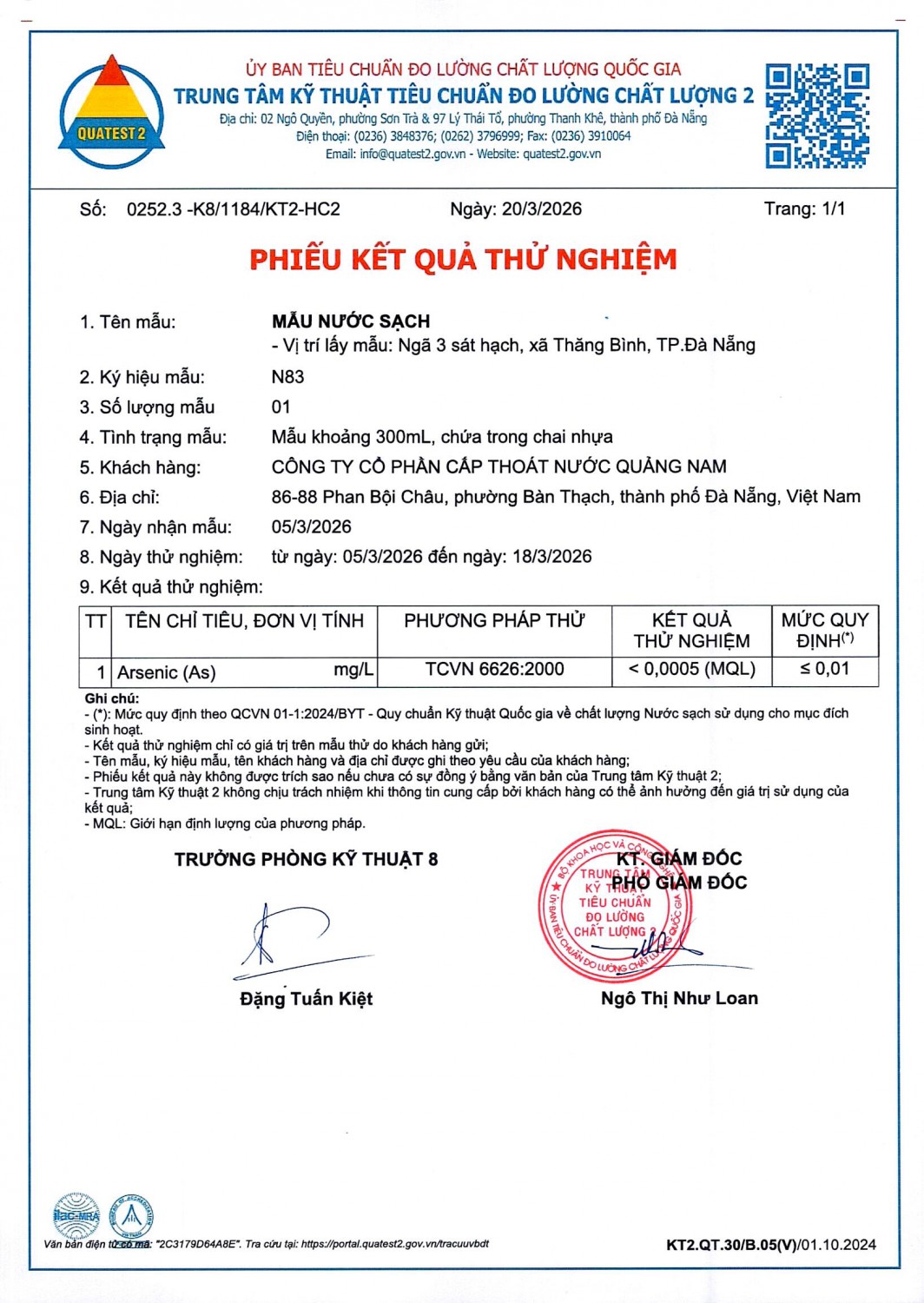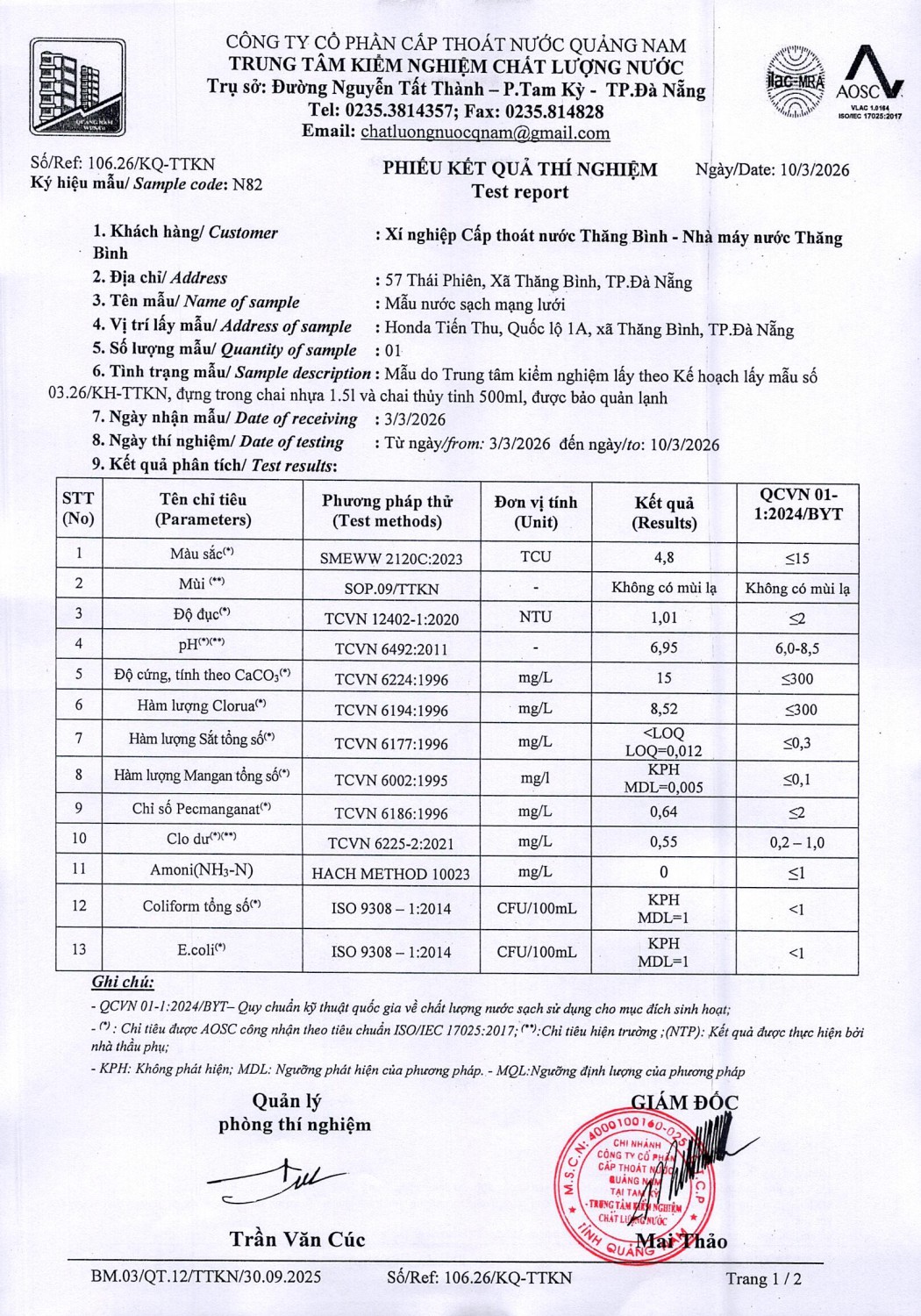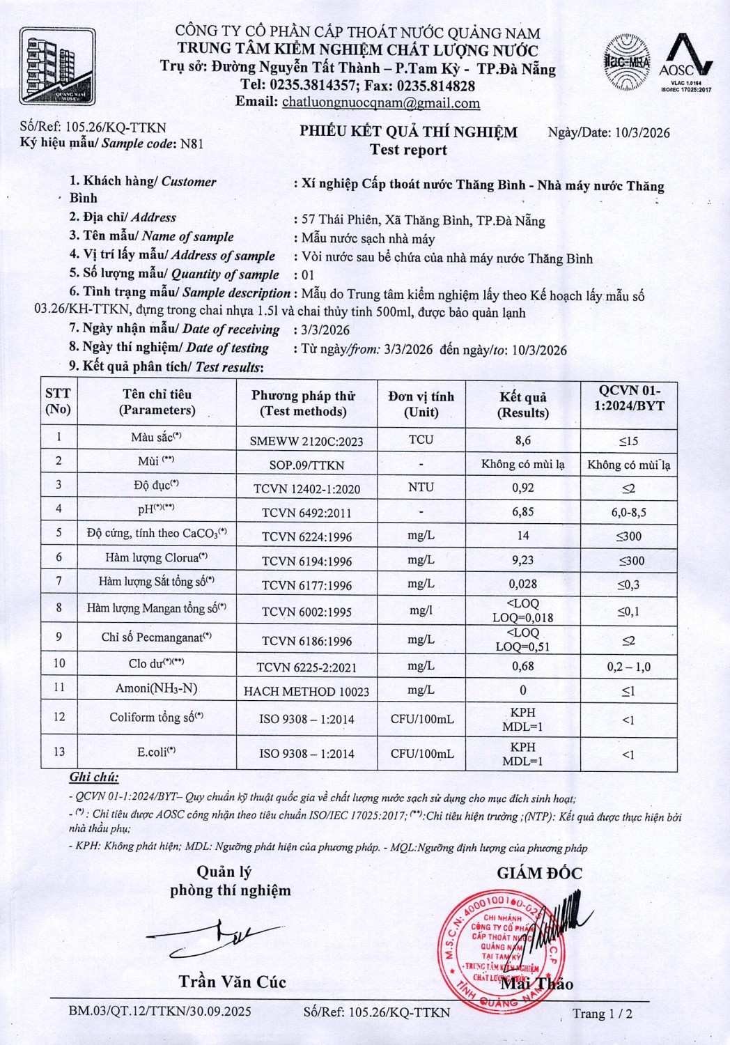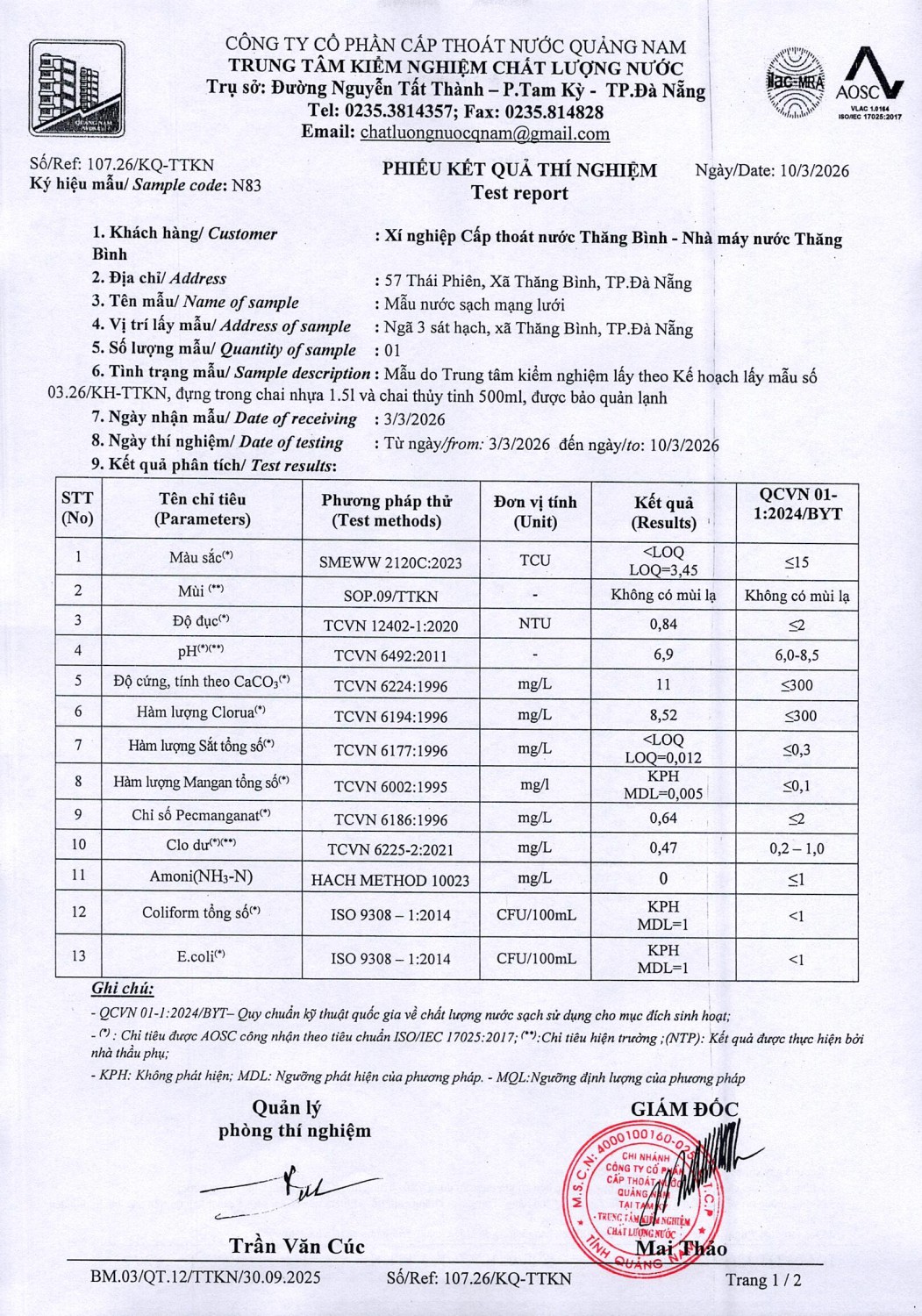 KẾT QUẢ CHẤT LƯỢNG NƯỚC XÍ NGHIỆP CTN THĂNG BÌNH - NMN THĂNG BÌNH ĐỢT 1 THÁNG 3 NĂM 2026