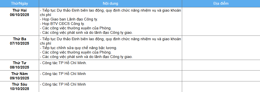 Lịch công tác từ ngày 06/10/2025 đến ngày 12/10/2025